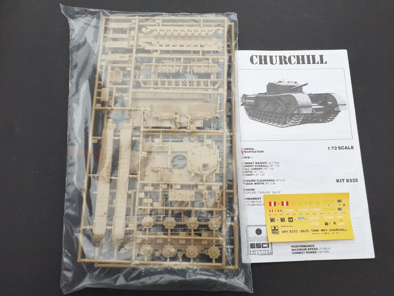 Besprechung:Churchill Mk. IV Tank:Wie schon andere Combi-Sets des Herstellers ESCI erschien diese Kombination im Jahr 1989. Die Formen des Mk.IV "Churchill" Tanks (KIT 8332) gehen auf das Jahr 1977 zurück. Dieser wurde immer wieder aufgelegt. Das Fahrzeug hat durchaus seine Berechtigung. Trotz des Alters lässt sich ein ansprechendes Modell bauen. Die Ketten liegen als Segmente bei (keine Gummiketten), die Turmluke kann geöffnet dargstellt werden. Im Bausatz sind eine britische und eine kanadische Decalvariante enthalten. Den Churchill-Tank gab es von Esci auch in der Minenräumvariante.