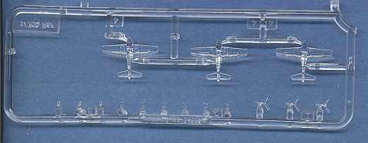 Das BordgeschwaderDie Flugzeuge sind aus klarem Plastik hergestellt. Das erleichtert die Darstellung der Cockpitverglasung ungemein (bei der Bemalung auslassen). Sie sind mit Propellern und Fahrgestell ausgestattet. Es sind 9 SB2C „Helldiver”; 12 F6F „Hellcat“ und 6 TBF „Avenger“ vorhanden.