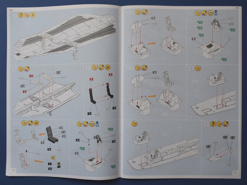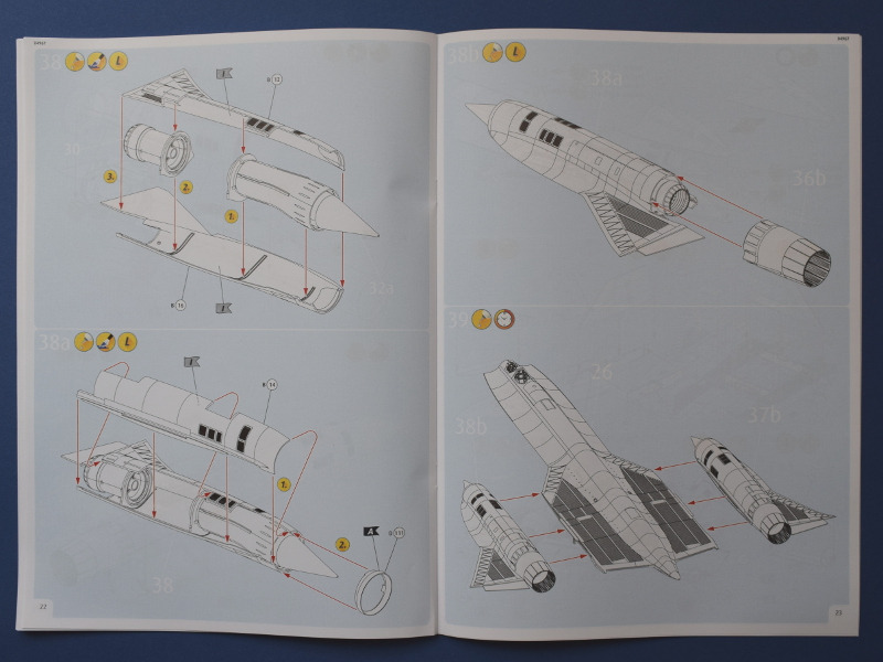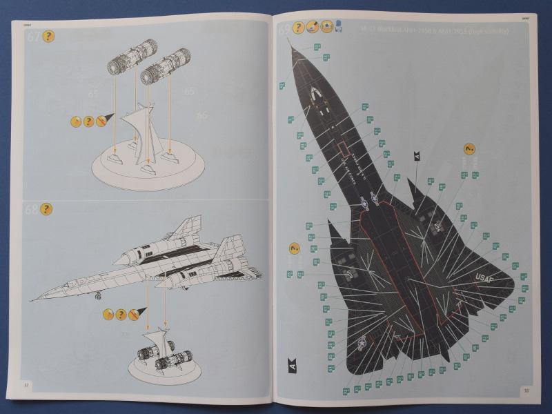 Die Bauanleitung......besteht aus 40 Seiten im Format A4 und führt in 68 Schritten zum fertigen Modell. Sie beginnt nicht, wie sonst allgemein verbreitet, mit den beiden Cockpits, sondern mit den beiden Rumpfhälften. Auch ist es nötig, das Fahrwerk schon in einer frühen Bauphase einzubauen. Wenn man jedoch die Fahrwerksbeine und Streben nicht verklebt, kann man sie in den Rumpf einklappen. So sind sie in den weiteren Bauphasen nicht im Weg und können später final verklebt werden. Die gelben Punkte mit den Hinweissymbolen (siehe Seite 3) in jeder Baustufe leiten verständlich durch die Montage. Jede Stufe hat auch einen Hinweis auf den Einsatz von Farbe und Platzierung von Decals. Gerade bei dem Cockpits hat man die Wahl, die Instrumente, Schalter und Regler selbst zu lackieren oder mit Decals zu belegen. Aber ob der Weichmacher die Nassschiebebilder so flexibel macht, dass sie sich zuverlässig um jede Erhebung legen, mag ich an dieser Stelle bezweifeln. Der Zubehörmarkt hat hier schon diverse Alternativen zur Auswahl bereit liegen. Um auf Nummer Sicher zu gehen, sollte man in der Rumpfspitze noch etwas Gegengewicht platzieren. Die Farbangaben der Bauanleitung beziehen sich auf das bekannte Revell-Farbsystem. Aber bis auf einen Farbton braucht nichts angemischt zu werden. Wer aber meint, seine SR-71 einfach nur „schwarz" lackieren zu wollen, liegt falsch. Viele Farbfotos der „Blackbird" zeigen verschiedene Schattierungen von Schwarz. Ein Grund dafür mögen die außergewöhnlichen Belastungen der Lackierung bei diesen extremen Geschwindigkeiten und Flughöhen sein. Auch die Temperaturen, mit denen sich Teile des Flugzeuges während des Fluges erhitzen, spielen hier eine Rolle.