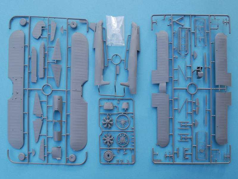 Der Bausatz von RevellDer Bausatz von Revell besteht aus 102 sauber gespritzten Teilen plus einem Bogen Naßschiebebilder für zwei Varianten. Es gibt bei den Plastikteilen keine Spur von Formversatz und Fischhäuten. Auswerfermarken sind ausschließlich in später nicht mehr sichtbaren Bereichen zu finden. Details an Rumpf und Tragflächen sind getreu dem Vorbild wiedergegeben, es gibt sowohl versenkte Stöße wie auch erhabene Strukturen und Applikationen insbesondere in den Bereichen um die Fahrwerke. Auch das Cockpit mit den Andeutungen der inneren Strukturen ist gut wiedergegeben. Alle Ruderflächen können separat angebracht werden. Der Bausatz ist in grauem Plastik gespritzt und auf vier Rahmen verteilt, hinzu kommt ein kleiner Rahmen mit den Klarsichtteilen der beiden Windschutzscheiben. Aufgrund der sehr hohen Qualität des Bausatzes sind auf den ersten Blick nur die Rahmenangüsse zu versäubern. Nur aus der Box gebaut, gibt dieser Stearman-Bausatz schon ein gutes Bild. Der geübte Profi wird sicherlich noch einiges mehr aus diesem schönen Kit herausholen wollen. Auch eine Elektrifizierung bietet sich an, mit laufendem Propeller und leuchtenden Positionslampen ist dann auch dem Spieltrieb nachgegeben.