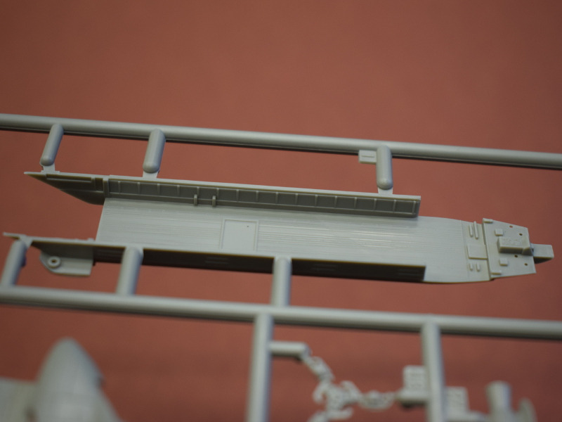 Der Guss ist insgesamt sauber. Sämtliche Gravuren und Details sind ohne Unreinheiten oder Abweichungen zu erkennen. Lediglich die Breite der Gravuren wirkt überdimensioniert. Der transparente Spritzling ist leider nicht ganz schlierenfrei. Cockpit, Boden im Frachtraum und die Trittfläche der Ladeluke sind fein detailliert. Im Kontrast dazu stehen leider die unschönen Innenseiten der Rumpfhälften, welche gründlich abgeschliffen werden sollten.