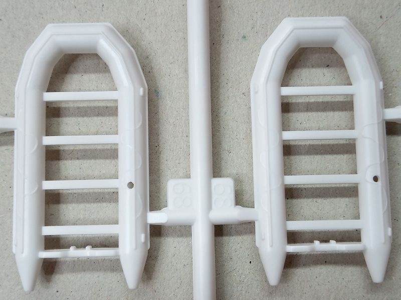 Alle anderen Spritzrahmen sind zusammen in einer Folientüte verschweißt. In dieser ist auch das Takelgarn, in einem separaten Kunststofftütchen verpackt, enthalten. Der große weiße Spritzrahmen beinhaltet als größtes Teil den Modellständer. Des weiteren finden wir hier alle Decksaufbauten, die Tenderboote, Davits, Anker, Radar, Rettungsboote und so weiter. Die Bauteile sind gut detailliert und recht sauber gespritzt. Ich habe nur eine sehr unauffälige, kleine Sinkstelle entdeckt. Die Nagelbänke sind sehr filigran und der leichte Grat bzw. Formversatz, den man auf dem Detailfoto erkennen kann, lässt sich ohne Vergrößerung nicht wahrnehmen. Da in den Bauberichten hier auf Modellversium oder bei Modellmarine keine Probleme bezüglich Bruch beim Erstellen der Takelung erwähnt werden, wird die Stabilität wohl ausreichend sein. Hier ist aber bestimmt Fingerspitzengefühl gefragt, damit die Nagelbänke am Ende nicht durch zu hohe Zugspannung krumm und schief sind. An zwei Bauteilen müssen leider jeweils drei Auswerfermarken verspachtelt und verschliffen werden; alles gut zugänglich und später auch nicht mehr ganz frei liegend. Die Niedergänge wrken im Vergleich mit den anderen Bauteilen eher ein wenig plump.