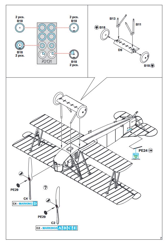 Fahrwerk und die Verstrebungen sind ebenfalls filigran. Gerade bei den Rädern gibt es wieder verschiedene Varianten. Die Flügel gerade aufzusetzen ist wohl die größte Herausforderung, hier muss immer wieder geschaut werden, ob das auch alles gerade steht. Ansonsten gibt es an Motor und Rumpf noch viele Kleinteile, die den Flieger dann noch mehr Leben verleihen. Der Umgang mit den kleinen PE-Teilen, wie z.B. den Fluginstrumenten, wird sehr viel Geduld erfordern, damit man diese nicht ans Teppichmonster verliert.