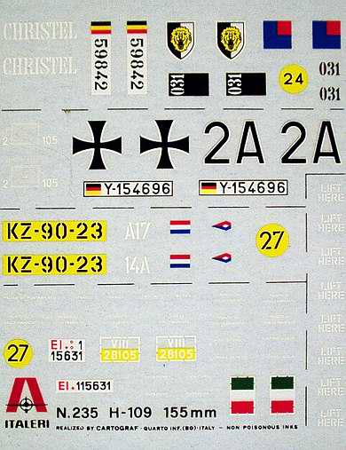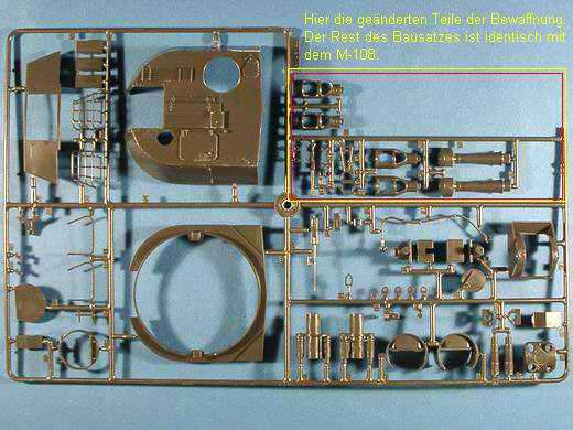 Besprechung:Fast identischer Inhalt wie der Bausatz der M-108. Lediglich die Hauptbewaffnung und andere Decals unterscheiden die beiden Modelle voneinander. Auch hier gilt das Gleiche wie bei dem oben schon genannten Bausatz. Das Modell ist ein aus 3 Spritzlingen bestehender Bausatz, dessen Teile recht ordentlich gespritzt sind und auch kaum Grat aufweisen. Das gilt auch, von einigen Auswerfermarkierungen auf der Innenseite mal abgesehen, für die beiden Vinyl-Antriebsketten. Der Decalbogen ist konturennah und matt gedruckt. Ein Faltblatt im typischen Italeri-Format umfasst 8 Seiten, die in 10 Schritten den Zusammenbau des Modells erklären. Hier findet man auch alles was man zur Farbgestaltung wissen muss und die Hinweise wo die Decals anzubringen sind. Einziger Kritikpunkt ist die fehlende Einzelverpackung der Bausatzkomponenten. Dies kann, auf dem Weg vom Hersteller zum Kunden, zur Beschädigung einzelner Bauteile durch Abreißen vom Spritzling führen.