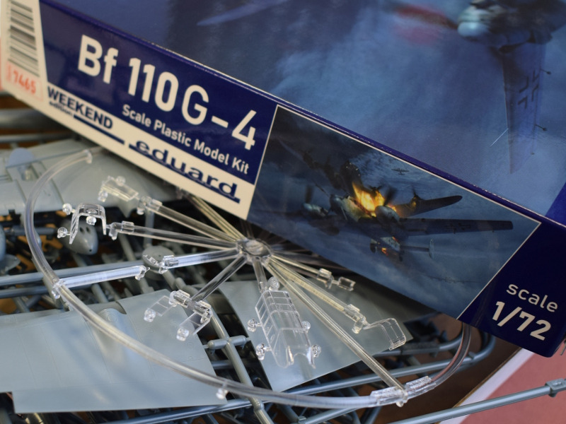 Der BausatzDer vorliegende Bausatz der Bf 110 G-4 von Eduard ist auf den ersten Blick eine Wiederauflage der WEEKENDedition mit der Nummer 7422 aus dem Jahr 2013. Der ProfiPACK hat die Nummer 7094 und war ab 2017 auf dem Markt. Als erstes fällt auf, dass Eduard das Kartondesign deutlich interessanter gestaltet hat. Ein Blick auf die Kunststoffteile des Bausatzes zeigt, dass es hier keine Veränderungen gegeben hat. Neu ist, dass in dieser WEEKENDedition eine kleine Ätzteilplatine für die Antennen des FuG 202 Lichtenstein B/C Radar enthalten ist. Die Bauanleitung und der Markierungsbogen wurden ebenfalls überarbeitet. Die Bauteile weisen viele Details auf und sind stellenweise sehr filigran. Unsauberkeiten an den Spritzrahmen sind keine zu finden. Nietenreihen sind als Details auch dargestellt, doch nur stellenweise. Enige Teile werden nicht für die G-4-Version benötigt und sind in der Bauanleitung klar gekennzeichnet. Zusätzlich kann die Cockpitabdeckung geöffnet oder geschlossen dargestellt werden und das Fahrwerk ein- oder ausgefahren gebaut werden. Eduard hat sich die Mühe gemacht, die Öffnungen der Flammenvernichter offen darzustellen. Nur die Querruder lassen sich in einer anderen Position befestigen - alle anderen Ruderflächen leider nicht. Die Reifen des Hauptfahrwerks sind nicht belastet dargestellt. Die optionalen Bauteile für die jeweilige Lackierversion werden unterschieden in: