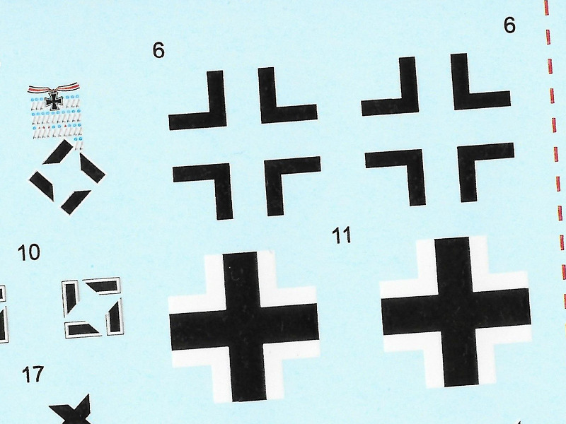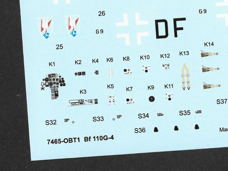 Die MarkierungsbögenDie Markierungsbögen sind glänzend und augenscheinlich versatzfrei gedruckt. Das Instrumentenbrett kann mit einem Decal belegt werden. Die Details z.B. für das Funkgerät und die Radargeräte, können mit einzelnen, kleinen Decals dargestellt werden. Auch die Sitzgurte sind als Decals enthalten. Jedoch bevorzuge ich hier mehr plastische Bauteile z.B. aus Ätzteilen. Für die Wartungshinweise ist ein zweiter Markierungsbogen enthalten, der keine Wünsche offen lässt.