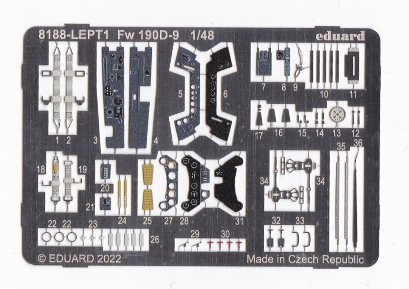 Besprechung:EinleitungDie Focke Wulf Fw 190 D entstand im Rahmen des geplanten Höhenjägerprogramms. Im Oktober 1942 startete der erste Prototyp der D-0 Variante. Erste Exemplare der Fw 190 D-9 kamen zur III.7/JG 54 im September 1944, gefolgt von der I./JG 26 im November. Bis Kriegsende waren es 366 gebaute Fw 190 D, wovon 183 die Frontverbände erreicht haben sollen. Gegenüber den A-Baureihen wiesen die D-9 einige Änderungen auf. Neben dem flüssigkeisgekühlten Reihenmotor Jumo 213, der eine Änderung des Motorbereichs samt Ringkühler notwendig machte, wurde der Rumpf durch den Einbau der sogenannten Rumpftonne um 50 cm verlängert. Die Seitenflosse wurde ebenfalls verlängert und der Rumpf bekam seitlich unterhalb des Cockpits je zwei Verstärkungen. Rumpf- und innere Flügelbewaffnung wurden beibehalten, jedoch auf die äußeren MG 151/20 verzichtet. Der BausatzEduard erfreut seit kurzer Zeit die Modellbauergemeinde mit einer Wiederauflage der Fw 190 D-9, dieses Mal in der Profipackedition. Die Teile sind allesamt bekannt. Neu sind nur einige der Bemalungsoptionen. Der Bausatz strotzt mit einer Fülle von Teilen, er bietet die Möglichkeit, die Abdeckung für die im Rumpf montierten MG 131 sowie die der in den Tragflächen montierten MG 151/20 offen zu lassen. Vorbildlich ist die Tatsache, dass Eduard daran dachte, dass man bei der Dora-Baureihe durch den nach oben offenen Mittelteil des Fahrwerksschachts die Rückseite des Motors sehen konnte. Für die Darstellung desselben liegt der sichtbare Teil des Jumo 213 bei. Auch wenn Eduards Fw 190 D der derzeit korrekteste Bausatz in diesem Maßstab ist, so ist er nicht ganz einfach zu bauen, zumindest wenn man es wünscht, die Waffenabdeckungen geschlossen zu lassen. Bemalungsvarianten
