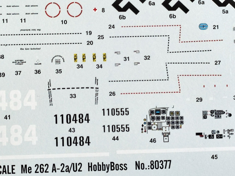 Für eine Bombervariante darf natürlich die Bombenlast nicht fehlen, diese wird unter der Nase angebracht und kann ebenfalls überzeugen. Insgesamt ein Bausatz, der absolut auf Höhe der Zeit ist und vermutlich der beste Me 262 Bausatz in diesem Maßstab erst recht bei dieser exotischen Version. Bemalung und AbziehbilderDer Nassschiebebogen ist sauber gedruckt und beinhaltetet eine Vielzahl von Wartungshinweisen, die Instrumenten sowie die Markierungen einschließlich der Swastika, die klugerweise so geteilt ist, dass man keine Sorgen haben muss, dass der Zoll diese entfernen würde. Es werden die beiden bekannten Versuchsflugzeuge als Vorbild angeboten. Beide sind in der Farbgebung gleich und unterscheiden sich nur in der Musterung:
