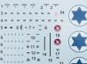 Der ca 16 x 9 cm große Decalbogen bietet uns drei verschiedene Maschinen an, je eine belgische, französische und israelische Ausführung. Alle drei sind aluminiumfarben, die belgische Maschine sticht mit ihren gelben Triebwerksgondeln optisch ein wenig hervor. Zu allen drei Nutzerstaaten gibt es auf der ersten Seite der Anleitung ein paar Informationen bezüglich des Einsatzes der T.7 im jeweiligen Land. Die Anleitung ist im üblichen DIN A5 Kleinformat mit einfarbigen Skizzen und Bemalungshinweisen "Made by Gunze". Der Decalbogen macht zunächst einen guten Eindruck, bei genauerer Betrachtung fällt auf, dass die Davidsterne nicht ganz perfekt deckend gedruckt sind. Es liegt wohl an der Farbe, denn auch bei den französichen Kokarden schimmert der weiße Untergrund am Rand durch. Auch manche der Wartungshinweise sind mehr Striche als Schriften. Dafür ist der Druck perfekt, im Register es gibt keinerlei Versatz. Man ist halt mittlerweile recht verwöhnt...