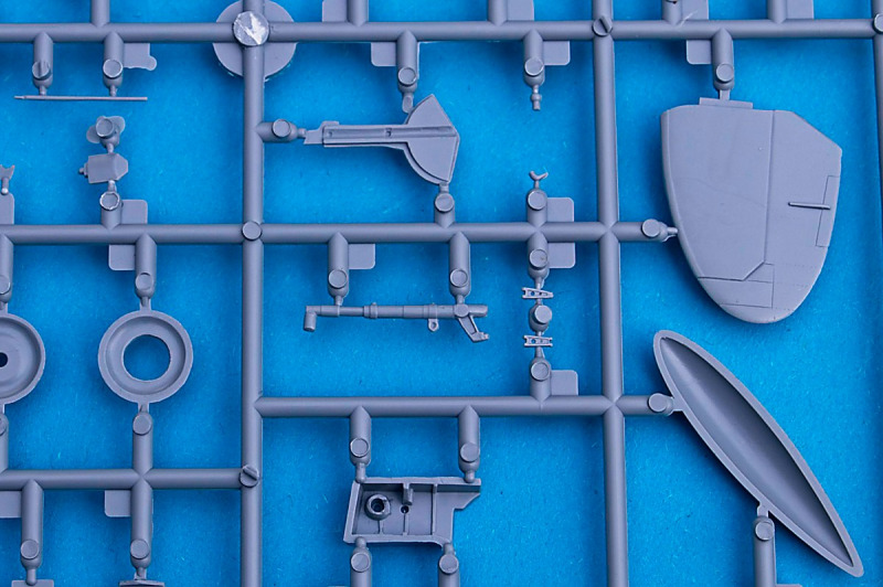 Der Bausatz ist eine Wiederauflage des bereits seit 2012 erhältlichen Modells. An den knapp 130 weitestgehend gratfrei gespritzten Bauteilen hat sich erwartungsgemäß nichts geändert. Die Detaillierung ist in Ordnung, wenn auch nicht überragend. Besonders im Cockpit kann man trotz vieler Bauteile (inklusive Ätzteile knapp 40!) noch einiges ergänzen, vor allem an den Seitenwänden. Es gibt eine kleine Platine mit Ätzteilen, hier sind z.B. die Sitzgurte und Teile für das Instrumentenbrett enthalten (gefertigt von Hauler in klassischer Manier, ohne Farbe und mit bedrucktem Film für die Skalen). Wem das zuviel Gefutzel ist, beim Instrumentenbrett kann man auch auf eine Decalvariante zurückgreifen oder, noch klassischer, einfach die erhabenen Details bemalen. Die Fahrwerksschächte bestehen ebenfalls aus mehreren Teilen und sind mit einigen erhabenen Details versehen. Die Fahrwerke selbst sind sehr filigran und detailreich, sogar die Federbeinscheren sind separate Teile mit durchbrochenen Bohrungen. Die Reifen sind mit einem leichten Längsprofil versehen, die Felgen sind in zwei Ausführung beigelegt. Die Bauanleitung spezifiziert allerdings nicht, ob man für die jeweilige Decaloption eine bestimmte Felge braucht.