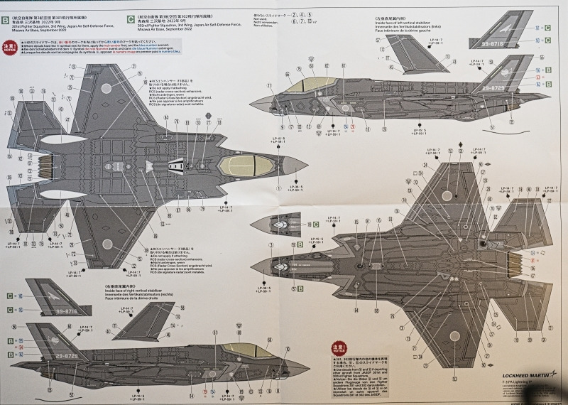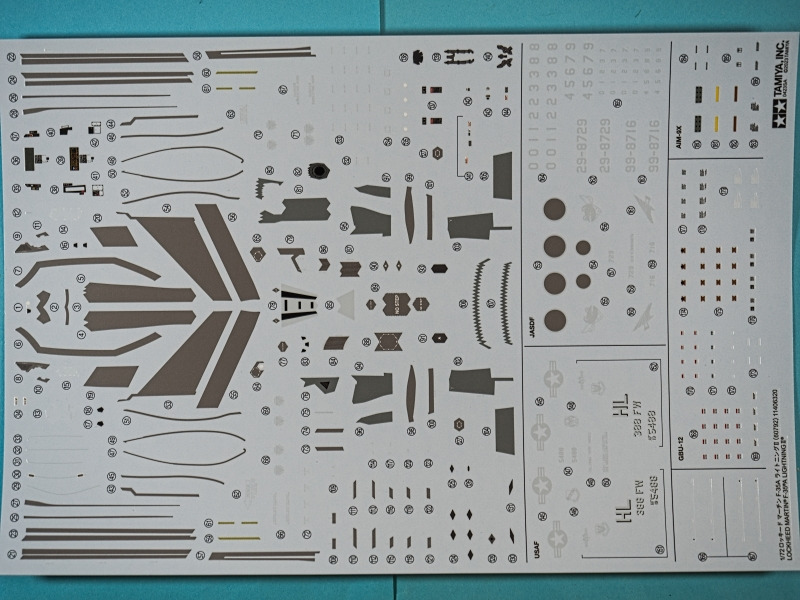 Sehr lobenswert ist die Beigabe von Masken für die Klarsichtteile. Bei den meisten anderen Herstellern liegen diese nicht bei. Die Abziehbilder enthalten sehr umfangreiche Markierungen für eine US-Maschine des 34th Fighter Squadron auf der Airbase Hill in Utha im Juni 2022, des Weiteren liegen noch Kennungen für Maschinen des 301st und 302nd Fighter Squardon der japanischen Selbstverteidigungskräfte bei, wie sie auf der Misawa Airbase im September 2022 im Einsatz waren. Bei den Decals gibt es eine Besonderheit – für den Helm des Piloten gibt es Decals die die Struktur des Carbons wiedergeben.