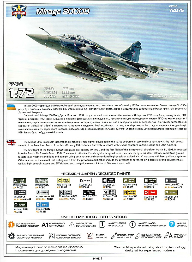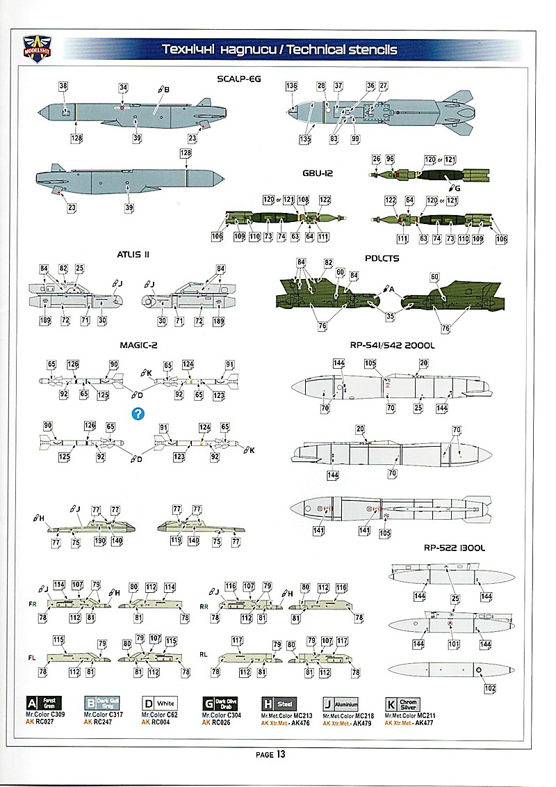 Die Einsatzgeschichte der Mirage 2000D lässt nur wenig Spielraum für mögliche Lackierungsoptionen, zumindest was die Geschwader angeht. Abgesehen vom EC3 wird diese Version nur noch vom CEAM und in Rotation beim  EC33 in Djibouti eingesetzt. Modelsvit hat nichtsdestrotz das beste draus gemacht und liefert uns drei mögliche Optionen: wie schon beinahe üblich, zwei normale Einsatzmaschinen und eine "Special Déco", hier in Form einer Jubiläumsmachine mit gelb-schwarzem Dekor zum 100. Geburtstag des SPA 95 "Martinet", einem der drei Staffeln des EC 1/3. Der wunderbar gedruckte Decalbogen hat´s wieder in sich, die Nummerierung geht bis 189, es dürften aber eher 300 einzelne Decals sein, viele sind vier- bis achtfach vorhanden. Die aktuellen Bauanleitungen von Modelsvit sind mit die Besten die ich kenne, superdetaillierte Zeichnungen und trotzdem übersichtlich! Farbangaben gibt es reichlich, leider nur für die Programme von AK und Mr.Color. Die Bemalungs- und Decalanleitung trägt den vielen Decals Rechnung, es gibt jeweils extra Seiten für die Wartungshinweise und für alle Außenlasten.