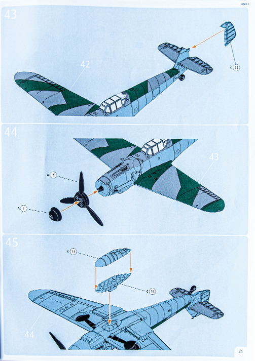 Der BausatzEs handelt sich hierbei um einen „easy click system" Bausatz der Messerschmitt Bf 109 G-6 im Maßstab 1:32 und richtet sich wohl ehr an eine jüngere Zielgruppe, die auch bestens vertraut ist mit Klemmbausteinen. Zum Zusammenbau wird kein Klebstoff benötigt, nur das übliche Werkzeug (Seitenschneider, Cutter, Schleifpapier). Farben werden auch keine gebraucht, da alle enthaltenden Teil bereits eingefärbt sind. Bei den Markierungen gibt es zweierlei, es können diese entweder als Decals oder auch als Aufkleber (Sticker) angebracht werden. Diese sind sogar so ausgelegt, dass das Modell, nachdem die Markierungen aufgebracht wurden, auch wieder zerlegt werden kann, ohne die Markierungen dabei zu beschädigen. Für einen „easy click system" Bausatz finde ich die Detailierung ausreichend. An den Spritzlingen sind mir keine Fehler aufgefallen. Lediglich die Spalten und Nieten könnten eventuell etwas ausgeprägter sein, falls man das Modell doch mit Grundierung/Farbe aufhübschen möchte. Die Markierungsbögen und die BauanleitungDie Decals/Sticker sind matt und augenscheinlich ohne Fehler gedruckt. Auf 26 Seiten im Format A4 bekommt man eine in Farbe gedruckte Bauanleitung. Die ersten drei Seiten enthalten praktische Tipps und Erklärungen zu den einzelnen Piktogrammen. Es folgt eine Seite mit der Option das Modell doch mit Farben zu bauen. (Anmerkung: Es gibt von Revell den gleichen Bausatz noch einmal, in diesem sind direkt die Farben enthalten. Die entsprechende Artikelnummer ist 63653, Preis UVP 43,99 €) Im Anschluss daran sind die einzelnen Spritzlinge abgebildet, was ich persönlich immer hilfreich finde, da es so leicht ist auf Vollständigkeit des Bausatzes zu prüfen. Auf den nächsten 19 Seiten wird man Schritt für Schritt durch den Bau der Messerschmitt Bf 109 G-6 geführt, wobei die optionalen Farben auch farblich dargestellt werden. Die Platzierungen der Decals/Sticker werden ebenfalls verständlich aufgeführt. Die Altersempfehlung 10+ würde ich anhand der Bauanleitung bejahen, sofern schon Erfahrungen mit Klemmbausteinsystemen vorhanden sind. Ein enthaltenes Klarteil muss bei diesem Modell nicht aufwändig abgeklebt und lackiert werden, da dieses als Scheibe hinter einem anderen Bauteil platziert wird.