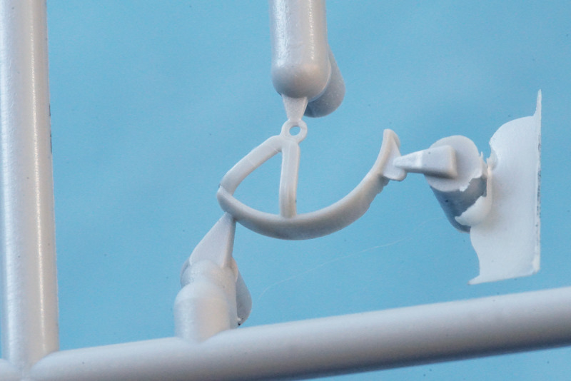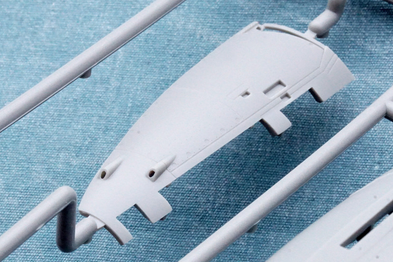 Schön nachgebildet ist das Instrumentenbrett samt Abdeckung Auf den Tragflächen findet man wieder sehr feine, scharf nachgebildete versenkte Nietreihen und Panellines. An den Tragflächenhinterkanten anmodellierte T-Stücke nehmen die separat anzubauenden Klappen und Querruder auf; am Höhenleitwerk ist das Ruder jedoch fest angegossen. An den Rumpfinnensiten sind Führungsnasen vorhanden, die eine korrekte Montage der Flügel gewährleisten. Vorbildgerecht liegen diesem Kit die Tragflächen mit Sägezahn und ohne Vorflügel bei. In der Höhe des Sägezahns ist ein fein und sehr dünn ausgeführter Grenzschichtzaun über die Tragflächenvorderkante zu montieren – in dieser Form auch nicht alltäglich. Auf der Tragflächenunterseite sind zwar Montagepunkte für Raketenpylone erkennbar, auch Pylone für die Positionierung in der Mitte der Tragflächen sind vorhanden; wie auch immer geartete Außenlasten liegen dem Bausatz aber nicht bei. Man kann dazu stehen, wie man will: Außenlasten gestalten das Modell durchaus interessanter, stören andererseits aber die charakteristischen Linien dieses ungewöhnlichen Flugzeugmusters.