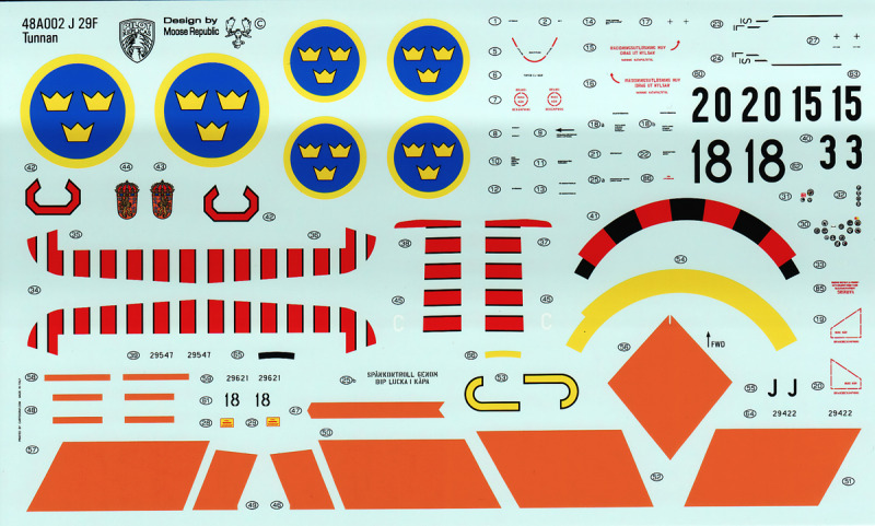 Die Decals......sind auf zwei von Moose Republic hergestellten Bögen verteilt. Der Druck ist sauber, scharf und versatzfrei, selbst kleine Schriften sind noch einwandfrei lesbar. Die verwendeten Signalfarben (Gelb, Rot und Leuchtorange) werden auf dem dünnen, glänzenden Trägermaterial brillant wiedergegeben.
