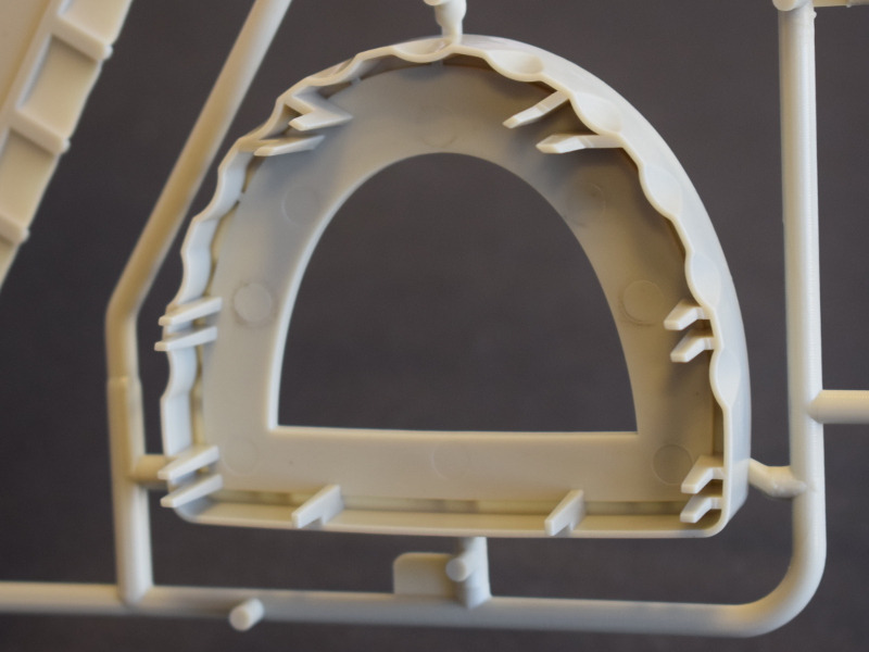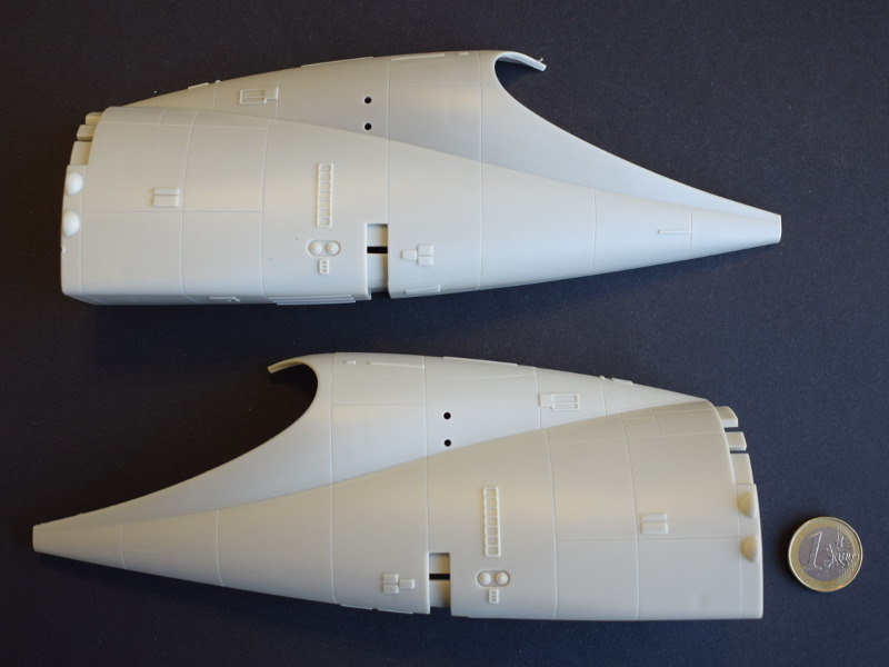 Die BausatzdetailsDer Stülpkarton ist etwa 53 x 35 x 9 cm groß. Im Inneren wird die Stabilität durch ein Stück U-förmig gefalteten Karton erhöht. Er enthält nur drei größere Spritzrahmen und einen kleineren für die Klarteile. Alle anderen Teile liegen lose bei, doch sie sind gut verpackt. Der große Displayständer kann seine Aurora-Abstammung nicht verleugnen. Hier wäre ein Standfuß besser gewesen, der sich im Design näher am Modell orientiert hätte. Die Bauteile sind sehr einfach aufgebaut. Moebius hat sich offenbar daran orientiert, dass das Modell eher von Filmfans gebaut werden würde. Es gibt eine größere Anzahl von versenkten und erhabenen Gravuren. Diese verteilen sich über die gesamte Fläche des Modells. Man kann zwar ein recht ansehnliches Cockpit einbauen, aber wer es nicht mit einer Beleuchtung versieht wird davon später, wegen des schmalen Klarteils, kaum noch etwas erkennen können. Etwas besser ist es beim Passagierabteil. Zumindest die äußeren Reihen der 40 Sitze sollten durch die Klarteile erkennbar sein. Eine Politur der Fenster ist auf jeden Fall angeraten. Die restlichen vier Klarteile sind für die Positionslichter bestimmt. Es gibt Modellbauer, die den Maßstab der Inneneinrichtung als zu groß bewerten. Ich habe einen der Passagiersitze mit einem Pilotensitz einer Bf 110 in 1:72 verglichen. Der Passagiersitz ist ein bisschen größer, aber der Unterschied ist für mich noch vertretbar, da so ein Sitz ja auch deutlich bequemer wäre als eine Sitz in einem WK2-Kampfflugzeug. Das fertige Modell hat eine beachtliche Länge von etwa 80 cm, eine Breite von etwa 37,5 cm und eine Höhe von etwa 6,5 cm.