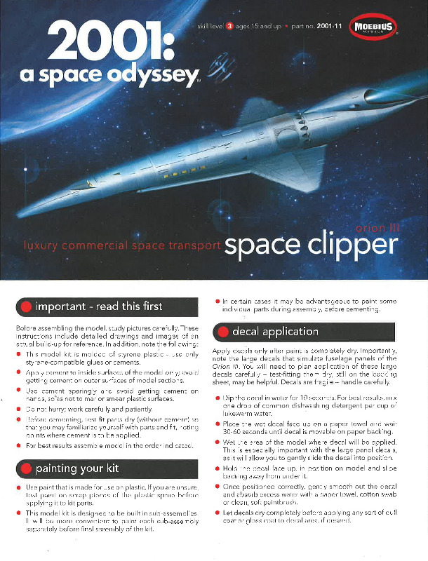 Die Bauanleitung......besteht - wie bei Moebius üblich - aus Zeichnungen und einer Benennung für jedes einzelne Bauteil. Sie führt in sieben Abschnitten zun fertig gebauten Modell. Auf der ersten Seite findet sich noch eine interessante Information: es war wohl ursprünglich geplant, dem Bausatz großformatige Decals beizulegen, mit denen die andersfarbigen Flächen abgedeckt werden sollten. Das hätte ein aufwändiges Abkleben und Lackieren vermieden. Man kann nur spekulieren, warum das kurzfristig doch nicht umgesetzt wurde, denn die Bauanleitung war offenbar schon gedruckt. Am Ende gibt es noch Lackierungshinweise, Tipps für Abnutzungsspuren und wo welche Markierungen platziert werden sollen. Bei der Farbgebung wird nicht auf einen bestimmten Hersteller hingewiesen. Der MarkierungsbogenJeder, der hier das markante Logo der Fluglinie oder deren Schriftzug erwartet hat, wird enttäuscht werden. Obwohl ein kreisrunder Platz für das Logo vorhanden ist, fehlt es. Die Orion III ist von außen nur wenige Sekunden großformatig zu sehen. Dort erkennt man nur die größten Details oder die, die wegen ihrer Farbe hervorstechen. Die kleinen Wartungshinweise auf den Flügeln sind so gut wie unsichtbar. Die Markierungen sind glänzend gedruckt. Wie gut sie zu verarbeiten sind, kann ich an dieser Stelle nicht bewerten.
