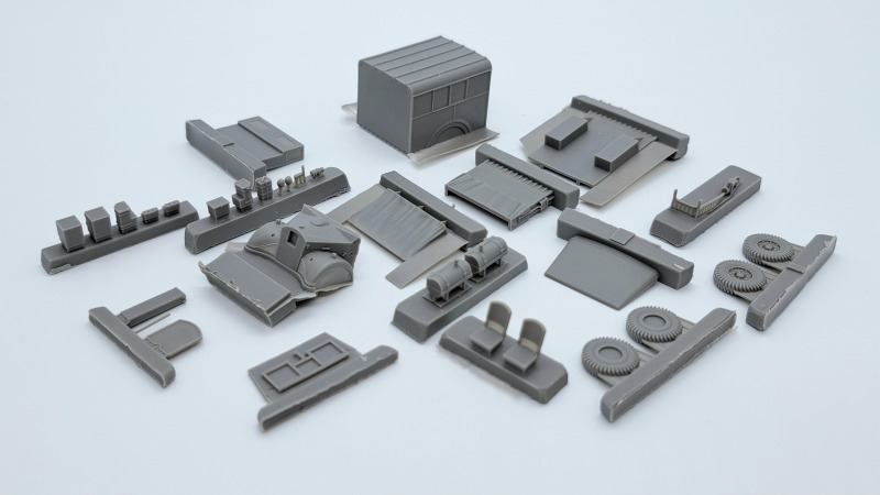 Der BausatzDer Bausatz beinhaltet alle wesentlichen Bauteile des Kit MV134. Für den Kofferaufbau liegt ein einteiliges Bauteil bei. Leider gibt es keine Option, die rückseitige Tür geöffnet darzustellen und es ist keinerlei Inneneinrichtung vorhanden. Die seitlichen Fenster des Kofferaufbaus sind mit einer Resinhaut verschlossen. Die Bauanleitung und Fotos eines Modells im Rohbau auf der Webseite des Herstellers zeigen die Fenster geöffnet, somit ist die Resinhaut vorsichtig zu entfernen. Das Verdeck der Fahrerkabine lag dem Kit MV134 noch als einteiliges Druckteil bei. Für den Van Body hat der Hersteller der Fahrerkabine die Option für eine Stoff- oder Stahlabdeckung beigelegt. Somit liegt die Rückwand der Fahrerkabine ebenfalls in zwei Ausführungen als separates Teil bei. Wie bereits durch unseren Autor Frank Richter beschrieben, ist die Qualität der Einzelteile hervorragend, sowohl in Guß- als auch Detaillierung.