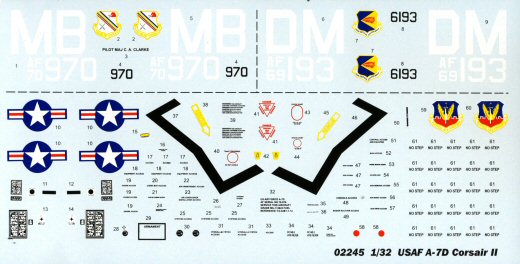 Die Decals erlauben die Darstellung von 2 Maschinen im klassischen SEA-Tarnkleid. Auf der ersten Blick machen sie einen guten Eindruck, der Druck ist scharf und versatzfrei, die Schrift ist auch bei kleineren Decals noch lesbar (abgesehen von den großen Typenschildern für den Fahrwerksschacht - sehr ärgerlich!!). Apropos lesbar - einige der Wörter sind falsch geschrieben, besonders die Stencils für die Waffen bestehen oft nur aus Kauderwelsch. Schade eigentlich, vielleicht gibt es ja irgendwann Abhilfe aus der Zubehörindustrie. Der Blauton der Hoheitszeichen erscheint mir etwas zu hell, das Weiß der Leitwerkskennung ist schon auf dem Trägerbogen ein wenig transparent, zudem stimmen die Proportionen der Schriftart, die übrigens "AMARILLO USAF" heißt, nicht. Ich persönlich würde daher in jedem Fall zu einem Zubehörbogen greifen