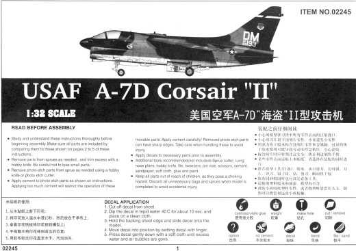 Ein paar der Waffen sind für eine USAF A-7D nicht zutreffend, z.B. die AGM-84E, in den meisten Fällen sind die "normalen" Eisenbomben die richtige Wahl. Ein nettes Schmankerl wäre noch ein ECM-Behälter à la ALQ-119 gewesen, aber man kann nicht alles haben. Die Aufmachung des Waffensets legt den Schluß nahe, dass dieses einmal als eigenständiger Bausatz erhältlich sein wird (eigener Decalbogen, Bezeichnung auf der Bemalungsanleitung).