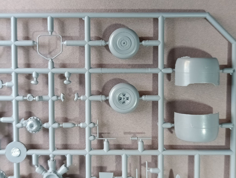Klarer Minuspunkt ist der Waffenturm. Dieser besteht aus zwei in der Mitte geteilten Klarteilen, was an sich auch in Ordnung ist, da die Trennnaht entlang einer der Streben verläuft, was aber nicht in Ordnung ist, ist das untere Klarteil, wo sich ein riesiger Auswurfast befindet, der nur sehr schwer zu entfernen ist, dabei ist auch viel Material auf der Scheibe, was alles vorsichtig entfernt und anschließend aufpoliert werden muss, um das später nicht mehr zu sehen, dies bedeutet wirklich viel arbeit und die ständige Gefahr das Teil zu zerstören. Ansonsten besteht der Turm auch noch aus mehreren Plastikteilen, die die Rahmenkonstruktion und den Sitz bilden, und dem Vickers-K-Maschinengewehr, welches aus Resin und zwei kleinen Ätzteilen besteht. Die restlichen Klarteile sind absolut in Ordnung. Schön finde ich, dass für die Klarteile auch Klebemasken von Haus aus vorhanden sind.
