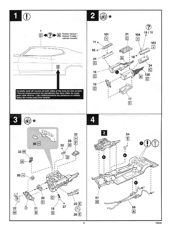 Die Bauanleitung ist im bekannten Stile der US-Bausätze von Revell gehalten. Hier haben die farbigen Skizzen irgendwie noch keinen Einzug gefunden. Durchgehend schwarz-weiss dafür aber recht informativ und übersichtlich aufgebaut. Wie üblich gibt es eine komplette Teileübersicht nur in Worten, so weiß man weingstens immer welches Bauteil man gerade verbaut. Eine echte Seltenheit ist dass man hier mal keine der benötigten Farben mischen muss! Die alternative Twister Version ist ein extrem seltenes Sondermodell welches ausschließlich für die Ford Hänfdler in Kansas City gebaut wurde. Angeblich wurden nur ca. 90 Fahrzeuge gebaut, alle waren in Calypso Coral (orange) lackiert. Der Decalbogen ist recht umfangreich ausgefallen und enthält einige nützliche Elemente wie z.B. Instrumente oder die Reifenbeschriftungen. Das Decal für die Motorhaube hat eine sportliche Größe, aber was wäre Modellbau ohne Herausforderungen :) Typenschilder, Embleme und einige Werbeaufkleber verleihen dem fertigen Modell den letzten Schliff.