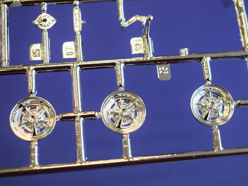 Die Reifen sind aus dem üblichen schwarzen Weichplastik, man könnte meinen Revell legt da bei jedem Modell dieser Ära dieselben Teile bei. Es gibt ein Profil aber das gefällt mir weniger gut. Die Seitenwände sind glatt, immerhin gibt es ein paar Decals für den damals oft in weiß hervorgehobene "Firestone" Beschriftung. Der Innenraum steht dem Äußeren in Nichts nach, auch dieser ist sehr schön wiedergegeben mit separaten Pedalen und Schalthebeln. Armaturenbrett und die Seitenverkleidungen haben schöne erhabene Details, für die Instrumente liegt ein passendes Decal bei. Die hauchdünnen und glasklaren Scheiben ermöglichen einen ungetrübten Blick in den Innenraum. Sämtliche Leuchtengläser sind ebenfalls aus klarem Kunststoff, die Rückleuchten sind schon passend Rot eingefärbt. Immer wieder dasselbe Problem hat man mit den Chromteilen. Auf den ersten Blick machen sie einen hervorragenden Eindruck, bei genauerem Hinsehen stellt man fest dass man einiges versäubern muss und am Ende besser fährt die Chromschicht runterzunehmen. In diesem Arbeitsgang wird auch die relativ dicke Schicht Klarlack entfernt der die Details meines Erachtens immer ein wenig verschwommen aussehen lässt.