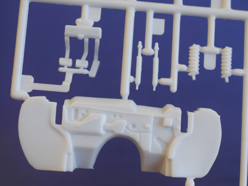 Der 1970er Torino ist schon etwas länger im Programm von Revell bzw. Monogram zu finden, er ist Anfang der 2000er Jahre zum ersten mal aufgelegt worden. Es gab einige Wiederauflagen, die letzte datiert auf das Jahr 2014. Es gibt insgesamt 128 Bauteile die in dem inzwischen üblichen Weiß gespritzt sind. Die Gussqualität ist nachwievor sehr gut, es gibt stellenweise ein wenig Grat der aber schnell entfernt ist. Das Modell hat einiges an Details zu bieten, alleine der Motor besteht aus knapp 20 Bauteilen. Zusammen mit dem ebenfalls sehr schön wiedergegebenen Motorraum reichen schon ein paar selbst gefertigte Zündkabel für einen Top-Eindruck. Die Motorhaube kann beweglich angebaut werden, allerdings sind die Blechstrukturen auf der Innenseite nur vage angedeutet. Weiter gehts mit dem Fahrwerk, auch hier wurde größtmöglichen Wert auf eine originalgetreue Ausführung gelegt. Es gab ja schon Modelle mit stark vereinfachten Achsen und Abgasanlagen. Der Unterboden ist fast zu schön um den Wagen auf die Räder zu stellen.