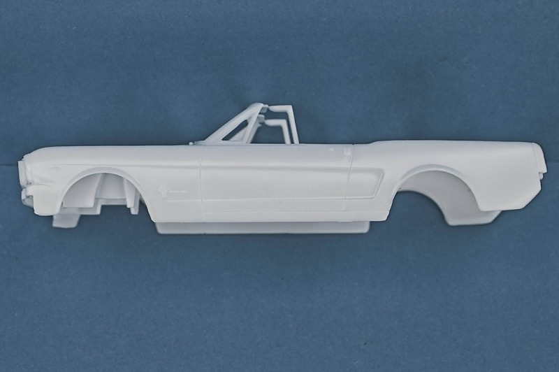 Bei dem Bausatz handelt es sich um den hinlänglich bekannten Mustang aus dem Revell-Programm. Seit vielen Jahren ist er fast durchgängig mal als Coupé, Fastback oder eben dieses Cabrio verfügbar. Ursprünglich stammt dieser Bausatz aus dem Hause Monogram, dort kam er Mitte der 1980er Jahre in den Katalog. Gut zehn Jahre später ist dann zum ersten Mal das Cabriolet erschienen. Für diese Sonderedition hat man sich noch nicht einmal ein neues Deckelbild einfallen lassen, es ist exakt dasselbe wie bei der 2010er Auflage. Sämtliche Kunststoffteile und auch der Decalbogen wurden ebenfalls unverändert übernommen. Als Extras liegen dem Set die übliche kleine Flasche Kleber, der mehr schlecht als recht brauchbare Pinsel sowie sechs kleine Farbdosen bei. Dafür möchte man bei Revell dann stolze 45 Euro haben. Die etwas weniger als 100 Bauteile können ihr Alter stellenweise nicht ganz verleugnen. Es gibt einige Auswerfer und auch die Fans von Grat und Fischhaut kommen nicht zu kurz. An manchen Bauteilen ist der Guss nicht ganz sauber, hier muss man Nacharbeiten entweder in Form von Auffüllen (Fehlstellen) oder Wegfeilen. Es ist aber keine große Sache, man darf halt keinen direkten Vergleich mit den aktuellen Bausätzen machen.