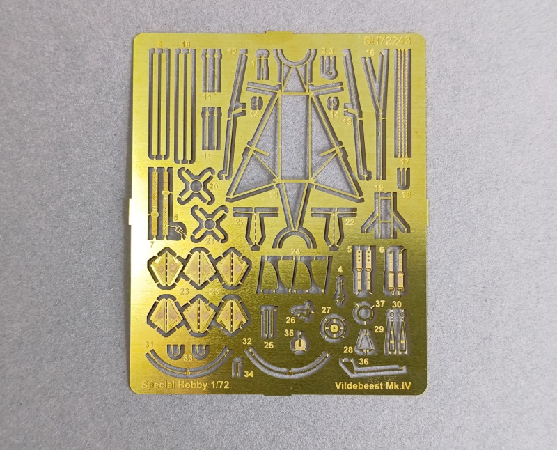 Der Bausatz:Die Vildebeest ist definitiv kein sehr bekanntes Flugzeug, so sollte es wenig verwundern, dass bis auf diese Form, welche ursprünglich bei Azur-Fromm im Jahre 2011 erschien, bisher nur (veraltete) Resin oder Vacubausätze existiert haben. Eine von AZ-Models angekündigte Bausatzform lässt weiter auf sich warten, wenn sie überhaupt noch erscheint. Special Hobby und Azur haben bis auf die Version Mk. II alle Varianten des Flugzeugs aufgelegt, womit man zumindest in 1:72 dieses Flugzeug gut abgedeckt hat. Die letzte Version der Vildebeest erschien bei Special Hobby 2013 und wurde letztmalig im November 2022 unverändert aufgelegt. Vom Kartondesign haben wir noch die ältere Version, daraus lässt sich auch schon schließen, das die Anleitung wahrscheinlich schwarz-weiß gehalten sein wird. Auf dem Cover sehen wir eine Vildebeest Mk. IV des 42. Squadrons während eines Patrouillenfluges. Bereits nach Öffnen des Stülpkartons wird klar, dass dieser Bausatz einiges an Zeit in Anspruch nehmen wird, denn wie für einen Short-Run Bausatz üblich, haben wir hier mehrere Baumaterialien bekommen, neben den Plastikspritzlingen haben wir noch Resinteile und eine recht umfangreiche PE-Platine. Qualitativ macht das ganze aber einen guten Eindruck, die Aufteilung der Spritzlinge ist allerdings etwas ungewöhnlich für Spacial Hobby, was aber nichts Schlechtes heißen muss.