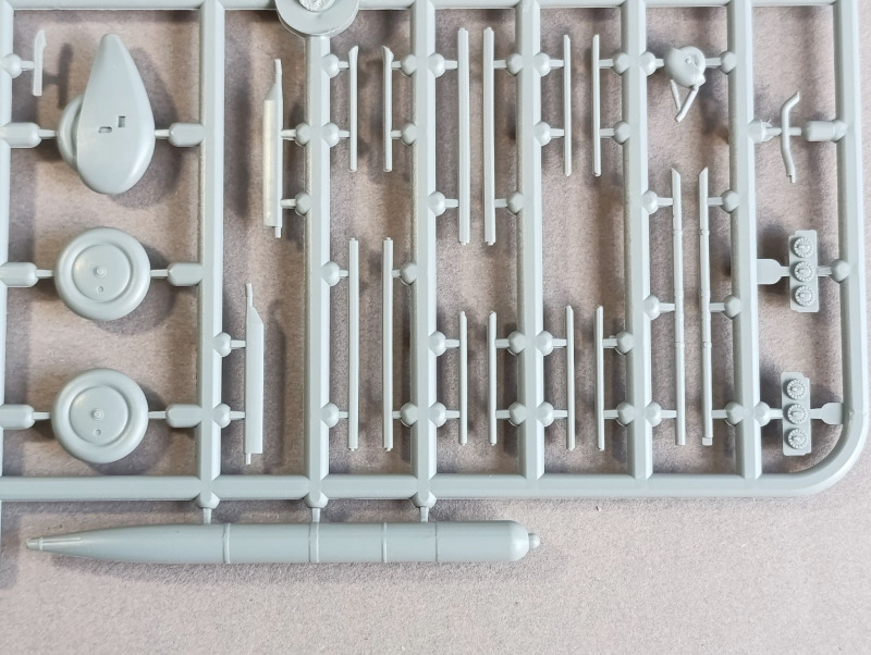 Dieses Filigrane zieht sich durch den ganzen restlichen Bau nun durch. Denn auch an den Flügeln finden wir kleine PE-Teile. Auch das Gewehr vom Heckschützen erhält Teile für Kimme und Korn. Überhaupt ist das ganze Bauteil richtig gut dargestellt. Das Fahrwerk ist etwas kompliziert anzubringen, weil es auch hier keine Passhilfen gibt, nur für die diagonale Strebe gibt es ein Passloch, dadurch ergibt sich dann aber der Winkel für das Fahrwerk. Verbaut werden sollen hier die Räder mit Verkleidung. Allerdings wird das hier als ein Teil dargestellt. Hauptunterschied zu anderen Versionen macht der Motor mit Verkleidung, hier hat Special Hobby etwas geschlampt. Der Perseus-Motor besteht aus Kunstharz und sieht richtig gut aus, doch laut Anleitung sollen hier an jedem Zylinder noch Abgasrohre aus Resin angebracht werden, jedoch liegen diese Teile gar nicht bei, auch auf der Seite des Herstellers sieht man auf den Übersichtsfoto das Teil nicht. Die Abdeckung sieht wiederum sehr gut aus, allerdings hat sich ein Teil vom Gussrahmen abgelöst. Es liegen drei Propeller bei: zwei Dreiblattpropeller, die identisch sind und ein Zweiblattpropeller. Die Halterung für den Torpedo besteht nur aus PE-Teilen, es ist also Erfahrung im Umgang mit solchen Teilen gefragt. Wirklich kompliziert wird dann aber wohl die Verspannung. Der Bauplan bietet hier leider nur eine Zeichnung, man sollte sich dazu das Cover noch zurate ziehen.