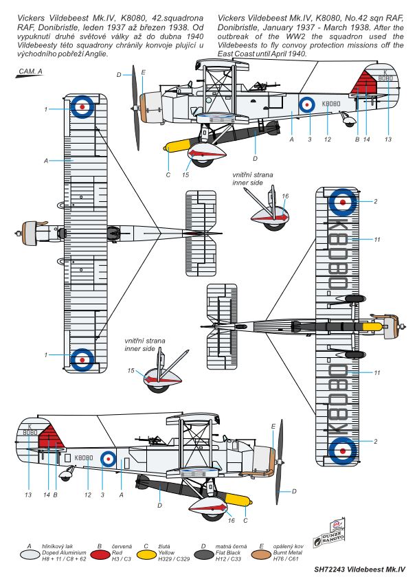 zum Original:Bei der Vickers Vildebeestn handelt es sich um einen landgestützten Torpedobomber, der im Auftrag des britischen Luftfahrtministeriums entwickelt wurde. Der Erstflug fand im April 1928 statt. Es wurden im Laufe der nächsten Jahre mehrere Versionen des Flugzeugs gebaut, welche sich im wesentlichen nur im verwendeten Motor unterschieden haben. Die Royal Airforce erhielt außerdem mit der Vickers Vincent ein aus der Vildebeest abgeleitetes Langstreckenaufklärungs- und Bomberflugzeug. Auch Spanien bekundete Interesse an dem Flieger, um es für deren Marine zu verwendeten, bedurfte es aber einigen Abänderungen. Vickers entwarf hierfür eine eigene Version mit Hispano-Suiza Motoren und auswechselbaren Schwimmern und Radfahrwerk. Eine Lizenzproduktion fand bei CASA statt. Die hier zu bauende Version Mk.IV war die letzte Variante der Vildebeest. Diese erhielt einen Perseus VII Sternmotor mit 825 PS und einer aerodynamischen Abdeckung, wodurch sie sich gut von anderen Versionen unterscheiden lässt. Der Prototyp erhielt noch einen Zweiblatt-Holzpropeller, die Serienmaschinen besaßen dann Dreiblatt-Metallpropeller. Insgesamt wurden 1937 18 Flugzeuge in der Version gebaut. Bei Ausbruch des Kriegs waren diese Maschinen noch im Einsatz. Die RAF nutzte sie für Patrouillenflüge an der Ostküste Englands, später wurden diese an die Luftwaffe Neuseelands abgegeben und ab 1941 zur U-Boot-Patrouille verwendet, bereits ein Jahr später wurden die Vildebeest in Ausbildungsstaffeln abgegeben, wo sie 1943 endgültig außer Dienst gestellt wurden.