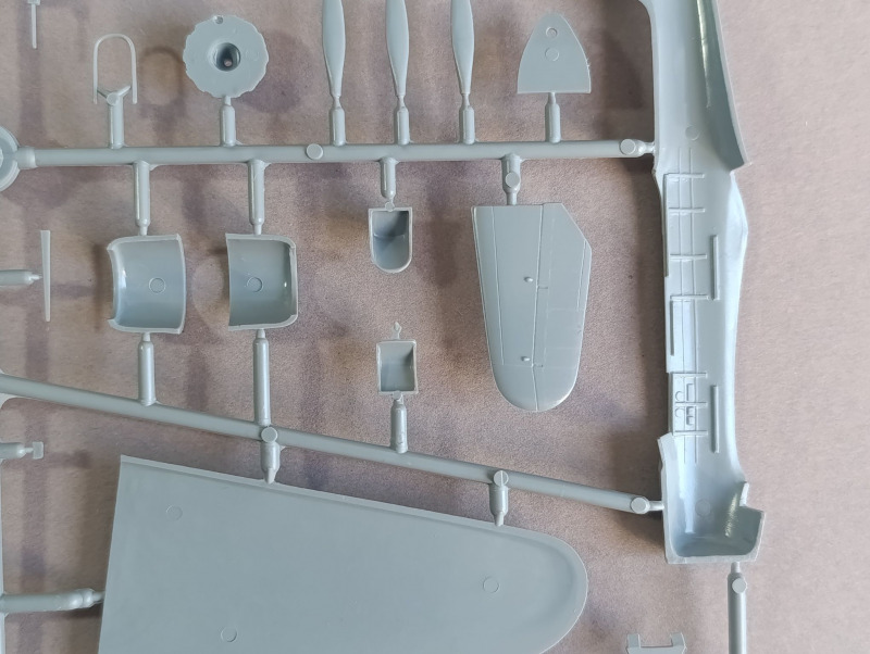 Es liegen dem Bausatz mehrere Motoren bei, benötigt wird aber für die holländischen Maschinen nur das Teil C7, welches das Relief eines Pratt & Whitney R-1830-S3GG darstellt. Das Teil ist also entsprechend einfach gehalten, kann aber durch eine gelungene Bemalung ausreichend realistisch dargestellt werden. Das Zusammensetzen der Motorabdeckung ist dann etwas tückisch, da diese nicht wirklich gut passt und ein kleiner Spalt entsteht, so muss hier nachgearbeitet werden. Es liegt eine einteilige Luftschraube bei. Alternativ gibt es auch einzelne Propellerblätter, welche aber für den Bau dieser Version nicht benötigt werden. Auch die anderen Kleinteile sind in Ordnung mit Luft nach oben, aber immerhin hat man hier auch an alles gedacht, selbst die Zieloptik ist im Bausatz bereits enthalten, wenn auch etwas zu stark dargestellt. Das Fahrwerk ist eher einfach gehalten, was aber auch dem Vorbild entspricht. Die Räder besitzen, wie bei Special Hobby üblich, keine nennenswerte Struktur und sind zumindest beim Hauptfahrwerk mittig geteilt. Die Cockpitverglasung ist samt dem Mittelteil zwischen den beiden Arbeitsplätzen einteilig und kann daher nicht ohne größere Umbauten geöffnet werden. Die Struktur der Streben ist aber gut wiedergegeben. Das Klarteil am Rumpfboden ist ebenfalls ganz gut gemacht, ermöglicht ohne weiteren Umbau aber leider keinen Blick ins Innere des Flugzeugs.