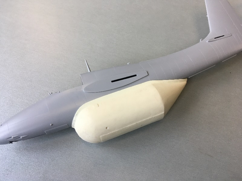 Der Tank wiegt etwa 75 Gramm, das hält das Fahrwerk des Bausatzes noch aus, aber die Hecklastigkeit des Kits nimmt durch die Feuerlöschtank-Installation noch zu. Wer hier noch ein bisschen Zeit investieren will, kann das Gewicht des Feuerlöschtanks durch Ausfräsen des inneren Bereiches reduzieren. Auch würde sich der Einbau von Mikromagneten geradezu anbieten, damit das Flugzeug wahlweise mit oder ohne Tank dargestellt werden könnte. Am Flugzeugrumpf muss die zentral montierte Aufhängung abgetrennt werden, damit der Feuerlöschtank seinen Platz findet.