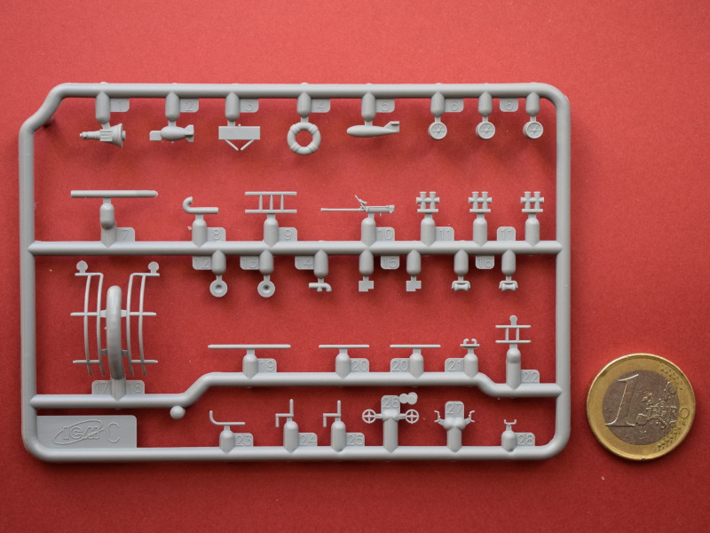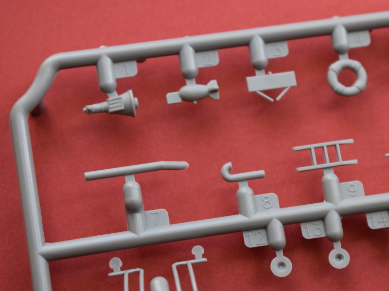 Der BausatzBereits 2023 bei ICM erschienen, wird der Vertrieb durch Revell seit 2024 erweitert. Die sehr sauber und detailreich gespritzten Bauteile sind auf fünf Rahmen verteilt, Rahmen A, B, zweimal C und der Klarsichtrahmen D. Diese Produkte moderner Formenbautechnik weisen keine Gussgrate oder gar Fischhäute auf. Auswerfermarken, selbst diese nur ein Hauch, sind ohne Ausnahme an nach dem Zusammenbau nicht mehr sichtbaren Stellen. Der zweiteilige Rumpf ist im unteren Bereich glatt, oberhalb der Wasserlinie befindet sich ein Barkholz und das Schanzkleid mit Plankenstruktur. Das einteilige Deck weist dezente, damit also gute Plankenstrukturen auf, die Positionen für Poller, Wabos, Winden und Deckshäser sind deutlich hervorgehoben oder eingesenkt. Auch die Fla-Plattformen weisen die feine Plankenstruktur auf. Die Fensteröffnungen des Deckshauses werden mit den Klarsichtteilen gefüllt, dem Kit liegen Rettungsringe und ein am Deckshaus zu befestigendes Schlauchboot bei. Am Heck werden die zwei Räumotter platziert, ebenfalls achtern sind die sechs Wabowerfer zu installieren. Dem Kit liegt ein kleiner Bogen mit Nassschiebebildern bei - die obligatorische Kriegsmarineflagge ohne Hakenkreuz und die taktische Nummer „61" für das in Norwegen eingesetzte Boot. Welcher KFK das war, verbleibt dem Modellbauer herauszufinden.