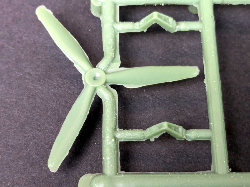 Der erste Blick in die Schachtel (übrigens ein Stülpkarton) aus der Ferne vermittelt ein recht guten Eindruck: zwei grüne Spritzrahmen mit vielen Teilen, und sie lassen schon die Größe des fertigen Modells erahnen. Geht man aber näher an die Bauteile ran und betrachtet sie etwas genauer, ist der Eindruck nicht mehr so positiv. Alle Konturen sind irgendwie verwaschen, gerade Kanten gibt es nicht. Es sind mehr Wellenlinien in alle Richtungen. Dazu gesellen sich Grat und Fischhaut. Auch einige Sinkstellen bzw. Sinklöcher kann man finden. Manche Kleinteile wirken sehr grobschlächtig. Aber ich muss sagen, ich hatte schon schlimmere Bausätze.