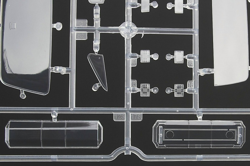 Der Innenraum steht dem bisher beschriebenen in nichts nach. Auch hier hat Revell einen sehr guten Job gemacht. Musste man sich in letzter Zeit oft mit "Decal-Details" zufrieden geben, sind hier "echte", plastische Details vorhanden. Türgriffe, Lüftungsschlitze, Fensterkurbeln usw. sind sauber geprägt. Ein paar Decals sind natürlich trotzdem vorhanden, alleine zehn Stück an der Zahl am Armaturenbrett. Dort findet auch Jim Hoppers Hut seinen Platz. Revell hat also nicht zu viel versprochen, was die vorbildgetreue Umsetzung im Bezug zur Serie angeht. Bei den Chromteilen hat man sich auf das Wesentliche beschränkt: Spiegel, Türgriffe Stoßstangen und ein paar Teile für die Räder. Ich bin zwar kein Freund von solchen Teilen, hier jedoch gibt es nix zu meckern. Keine störenden Grate oder Fischhaut wie sonst üblich und auch die Angüsse sind erstens klein und zweitens halbwegs günstig platziert. Die Klarsichtteile machen einen sehr guten Eindruck, schön dünn, glasklar und schlierenfrei. Wie üblich gibt es keine Fenster für die Türen, alle anderen sind jedoch vorhanden. Sämtliche Leuchtengläser und natürlich die Polizeileuchte sind ebenfalls auf diesem Teilerahmen untergebracht. Bleiben noch die Gummreifen, auch diese können mit dem Rest des Bausatzes sehr gut mithalten. Sie haben eine realistische Farbe und ein für ein 4x4 passendes Profil. Es gibt keinerlei Trennaht oder sonstige Angüsse. Aufstecken, fertig, sozusagen. Die Flanken sind glatt, ein kleines Manko, mit dem man sicherlich leben kann.
