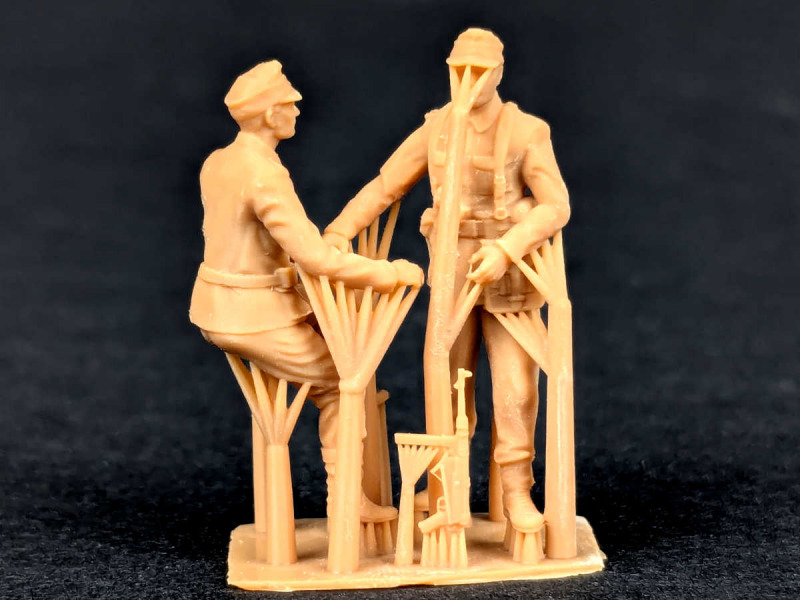 Bisher war CMK vor allem für die sauber gegossenen Resin-Bausätze bekannt. Nun ist man auch hier zum 3D-Drucken statt Gießen übergegangen. Und es hat sich gelohnt: hier gibt es zwei Wehrmachtsoldaten mit Fahrrädern. Ob die Fahrräder stimmig sind, habe ich bisher nicht recherchiert, aber wunderbar detailliert sind die auf alle Fälle. Sie besitzen die feinsten Strukturen bis hin zum Kabel am Dynamo, den Kettengliedern und Speichen. Und ja, es ist 1:72. Auch die Waffen, die für die Ausstattung der Fahrräder gedacht sind, sind umfassend detailliert. Es gibt MGs, Karabiner und Panzerfäuste, die in verschiedenen Kombinationen angebaut werden können. Beide Soldaten wirken auf dem Foto auch größer und nicht wie in 72facher Verkleinerung. Taschen und Faltenwurf etc. der Uniformen wirken absolut realistisch. Auch die Körperhaltung mit Fahrrad vermag zu überzeugen. Ich denke, Fahrrad und Soldat werden auch perfekt zusammenpassen. Übrigens gibt es die Fahrräder auch ohne Soldaten und beides auch in 1:48.