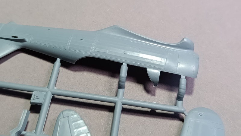 Der Bau beginnt mit dem Cockpit, wobei hier bereits die meisten Teile des zweiten Gussrahmens verbaut werden. Die Bauteile sind sehr kleinteilig und filigran. Allerdings sind einige Teile am Rand nicht ganz scharf gegossen, wie zum Beispiel die diversen Instrumententafeln, und sie weisen deutlich ausgeprägte Trennnähte auf. Die Gitterrahmen sind sehr gut wiedergegeben, jedoch muss man beim Austrennen und Versäubern vorsichtig sein, da sie sich leicht verformen oder brechen können. Seitenruderpedale, Steuerknüppel und Instrumententafeln sind gut gestaltet und haben feine Oberflächen. Leider liegen keine Abziehbilder für die Anzeigen bei. Was ich außerdem schmerzlich vermisse, sind Gurte für die Piloten – diese müssen also selbst gefertigt werden. Der Zusammenbau des gesamten Interieurs ist nicht ganz ohne und erfordert schon etwas Geduld, da die Teile sehr klein sind und einiges an Nacharbeit erfordern. Hat man das jedoch geschafft, erhält man einen sehr schön gestalteten Innenraum. Beide Rumpfhälften haben sehr schön versenkte Strukturen und können sich wirklich sehen lassen. Leichten Grat findet man am Fahrwerksschacht, der jedoch entfernt werden sollte. Das Innenleben passt insgesamt gut hinein, allerdings gibt es keine Passhilfen oder Markierungen im Rumpf, die anzeigen, wo genau das Cockpit eingesetzt werden muss. Daher bleibt nichts anderes übrig, als die Position grob abzuschätzen. Die Abdeckung der MGs direkt vor dem Cockpit ist als separates Teil ausgeführt. Hier sollte man allerdings aufpassen, da viel überschüssiges Material an dem Teil vorhanden ist, was nicht sofort auffällt – erst bei einer Anprobe wird es deutlich. Ich habe das überschüssige Material mit einer Resinsäge entfernt. Anschließend ist Spachteln notwendig, da die Passgenauigkeit bei diesem Bausatz – selbst für Special Hobby – alles andere als optimal ist. Außerdem sollte man beim Verkleben vorsichtig sein, da das Plastik relativ stark auf den Kleber reagiert. Besonders an kleineren Stellen bildet sich schnell eine Klebewulst.