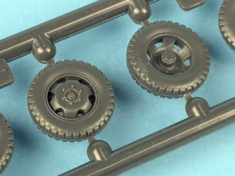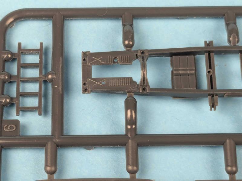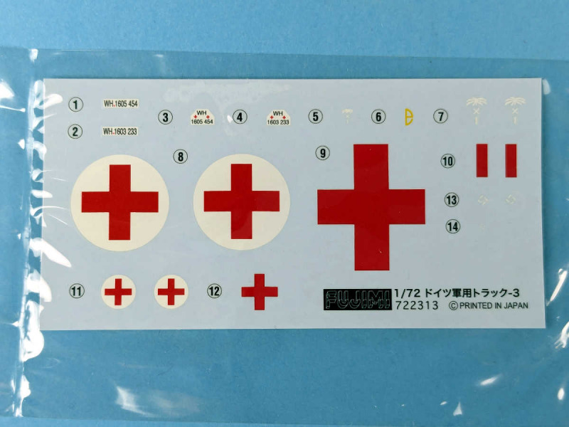 Alles, was bereits zum Tankwagen geschrieben wurde, gilt auch hier. Ein Großteil der Spritzrahmen ist ja auch identisch. Daher an dieser Stelle nur ein paar Gedanken zum Kofferaufbau. Der ist ebenso wie die anderen Bauteile sehr schön strukturiert. Tür- und Fensterrahmen sind ordentlich gestaltet und es gibt Haltegriffe, die in vorgefertigte Bohrungen eingesetzt werden sollen - also Detaillierung auf hohem Niveau. Und dann - es gibt keine Fenster! Auf dem Deckelbild sieht es aber richtig aus. Was soll das? Warum sind die Fensteröffnungen nicht vorhanden? Auch das Oberlicht auf dem Dach zeigt gute Strukturen, aber auch hier sind die Fenster nur angedeutet. Ich finde, das kann man nicht so lassen. Bei den Fenstern im Koffer könnte man noch sagen, weiß malen, da viele Sanitätsfahrzeuge weiße Scheiben hatten, um ein Hineinsehen zu verhindern. Aber beim Oberlicht muss man dann doch mit Säge und Feile ran. Ich verstehe Fujimi an dieser Stelle nicht. Die Decals sind sauber gedruckt. Es gibt zwei verschiedene Kennzeichen für das Fahrzeug. Leider unterscheiden sich die Bemalungen nicht, beide sandgelb mit weißem Dach. Eine Zuordnung zu Einheiten, Einsatzort sowie Einsatzzeit konnte ich nicht finden.