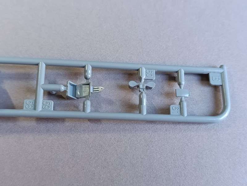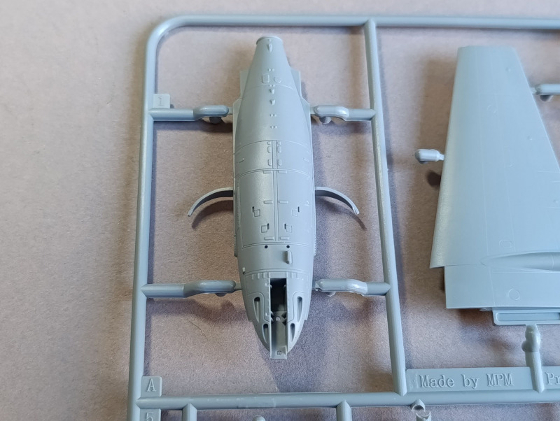 Der Rest geht dann recht schnell. Die Flügel werden zusammengesetzt, wobei diese horizontal geteilt sind, und der Lufteinlauf wird als separates Teil eingebaut. Auch die Teile für den Doppelrumpf sind mittig geteilt. Insgesamt machen die Strukturen einen guten Eindruck, und der Bausatz ist absolut auf Höhe der Zeit. Die Passung ist ebenfalls optimal. Die Passhilfen für das Höhenleitwerk sitzen allerdings etwas straff, daher würde ich empfehlen, diese ein wenig zu schleifen. Das Fahrwerk ist ebenfalls mit schönen Details versehen, nur die Räder sind vielleicht etwas einfach gehalten. Wen das stört, der findet bei CMK Resinräder als Alternative. Der Flieger wird auch nicht nackt gelassen und hat ein paar Außenlasten dabei, unter anderem zwei Zusatztanks, die aus mehreren Resinteilen bestehen, sowie vier Raketen. Meinen Recherchen zufolge handelt es sich dabei um panzerbrechende britische RP3-Raketen. Für die Leitwerke der Raketen werden zudem auch die PE-Teile benötigt.
