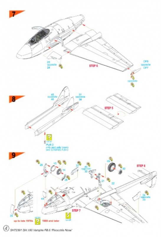 Der Bau beginnt mit dem Cockpit, das - in Anbetracht der Größe - gut dargestellt ist. Man findet zwei kleine Steuerkonsolen für die Seitenwände, einen gut nachgebildeten Steuerknüppel und ein detailliertes Instrumentenbrett. Am Cockpitboden sind auch die Seitenruderpedale angebracht. Besonders hervorheben möchte ich, wie exakt die Unterschiede zwischen den älteren und modernisierten Flugzeugen ausgearbeitet wurden. Dafür hat man sogar einen dritten kleinen Gußrahmen beigelegt. Hier findet man neben der veränderten Pinoccio-Nase und der Fahrwerksklappe auch Teile für einen neuen Sitz, der ab den 1960ern eingebaut wurde. Man muss sich also schon im ersten Bauschritt entscheiden, welches Flugzeug man bauen möchte, um den richtigen Sitz zu verwenden. Löblich ist auch, dass Abziehbilder für Gurte und die Instrumententafel beigelegt wurden – das war bei den meisten der von mir zuletzt gebauten Special Hobby-Bausätzen nicht mehr der Fall.