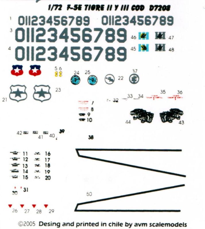 Neben dem eigentlichen Umrüstset lag dem Päckchen auch ein kleiner Decalbogen mit dem Hinweis "Free gift", also ein Geschenk bei. Dieser Decalbogen aus 2005 entstand somit noch vor dem Resinset und beinheilt neben den chilenischen Wartungshinweisen und Hoheitsabzeichen auch taktische Zahlen sowie den typischen Tiger-Doppelkopf und weitere Gestaltungen. Es scheint so, dass die Decals auf einzelnen Trägerfolien liegen. Allerdings ist die Folie sehr dünn, so dass eine abschließende Aussage zur Verarbeitung nicht getroffen werden kann. Alternativ bietet Aztec aus Mexiko F-5E Decals an, die auch chilenische F-5E Tiger III ermöglichen.