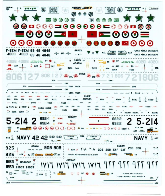 Die F-5A Freedom Fighter sowie ihre Weiterentwicklung, F-5E Tiger II, sind nicht nur bekannte Flugzeugmuster, sondern sie sind auch im Modellbau äußerst beliebt. Das zeigt sich unter anderem auch in der Tatsache, dass bis heute diverse Hersteller Modelle in den verschiedensten Maßstäben dieses Jets herausgebracht haben und es nach wie vor tun. Aber wie so oft, beschränken sich die allermeisten Hersteller primär auf Darstellungsmöglichkeiten von sog. Feinddarstellern der USA. Ergänzt wird dies allenfalls durch Gestaltungsvarianten von Nutzerstaaten wie Iran, Taiwan oder Korea. Genau hier setzt Aztec Models aus Mexiko an und präsentiert uns vorligendes Decalset mit einer wirklichen Auswahl an Darstellungen. Wie der Titel schon verrät, behandelt der Decalbogen thematisch die F-5A und F-5E und das weltweit. Hauptaugenmerk dürften hierbei die Gestaltungsmöglichkeiten für die brasialischen und chilenischen, aber auch für die jordanisschen und saudischen "Tigers" sein. Weiterhin enthalten sind Decals für Maschinen aus Kenia, Marokko, Tunesien und der Türkei, die mindestens genauso interessant sind. Neben den jeweiligen Hoheitsabzeichen und taktischen Zeichen, enthält das Decalset auch entsprechende Wartungs- und Sicherheitshinweise. Die Decals sind von hervorragender Qualität und zeichnen sich von ihrem versatzfreien Druck sowie der dünnen Trägerfolie aus. Typisch für Aztec Models. Das Set besteht neben dem Decalbogen und einem kleinen Ergänzungsbogen aus einer elfseitigen Anleitung, welche teils fabrig, teils schwarz-weiß ist sowie aus einem kleinen Bogen Maskierfolie. Die Anleitng enthält nicht nur interessante Mehrseitenzeichnungen der Flugzeuge sondern auch Hintergrundinfos. Grundlage der Farbangaben ist das Federal Standard System, welche in einer umfangreichen Tabelle auf die gängigen Modellfarbsysteme "umgerechnet" werden. Dazu gehören unter anderem Farben von Ammo of Mig, AK Interactive, Humbrol oder Vallejo. Da es keine Angaben zu empfohlenen Bausätzen gibt, ist vor Anbringung der Decals eine Trockenprobe notwendig und sinnvoll. Alles in allem ein empfehlenswertes Produkt aus Lateinamerika. Das Set ist direkt über Aztec Models beziehbar.