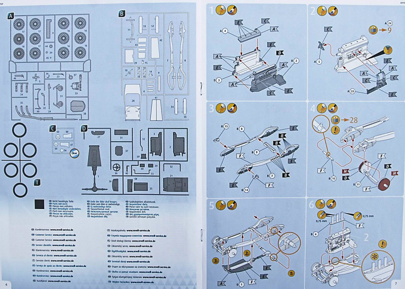 Dieser Bausatz ist zum ersten mal 1978 unter dem Label von Matchbox erschienen. Viele unter den älteren Modellbauern werden sich noch an die typischen Faltschachteln mit dem kleinen Fenster auf der Rückseite des Kartons erinnern. Nicht wenige von diesen Bausätzen dürften auf Kindergeburtstagen den Besitzer gewechselt haben. Sie waren relativ günstig und auch relativ einfach zusammenzubauen. Durch die mehrfarbig gespritzten Teile sahen die Modelle auch ohne Bemalung halbwegs gut aus. Netterweise hat Revell bei dieser Neuauflage - die erste seit 30 Jahren - dieses Feature beibehalten, wenn auch in anderer Kombination. Was sich der Bausatz über all die Jahre bewahrt hat, ist seine Einzigartigkeit. Noch immer gibt es kaum Spritzgussbausätze des SSKL, egal in welchen Maßstäben. Es gibt Fertigmodelle à la Burago bis hin zu fünfstelligen Preisen, Kleinserienbausätze in 1:43 und eben diesen hier in 1:32, noch immer der einzige in großer Serie hergestellte Bausatz. Der Bausatz besteht aus knapp 80 Bauteilen, verteilt auf einen weißen, einen grauen und einen silberfarbenen Teilerahmen. Bis auf das übliche unkenntlich machen ihrer Herkunft hat sich an den Teilen nichts geändert. Auch die Reifen wurden unverändert übernommen. Neu sind natürlich die Decals, der Bogen ist recht spartanisch ausgefallen, aber von guter Qualität. Der Guss der Teile ist ganz passabel, hier und da gibt es etwas Grat und Fischhaut. Die Sinkstellen an der Karosserie und am Tank konnte auch die moderne Spritzgusstechnik nicht vermeiden.