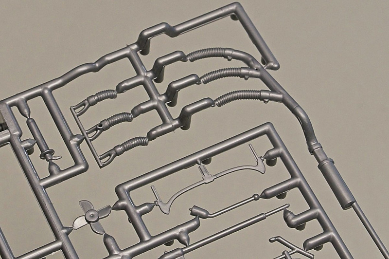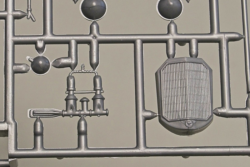 Die Detaillierung ist gar nicht mal so schlecht, zumindest bietet das Vorhandene eine gute Grundlage für ein schönes Modell aus der Schachtel oder - wer es möchte - für ein superdetailliertes Modell. Dafür muss man aber einiges an Arbeit investieren. Der Motor besteht aus fünf Teilen mit einigen angespritzten Details. Wer ihn später am fertigen Modell zeigen will, sollte die Motorhaube nur teilweise zusammenkleben. Dann kann sie später einfach abgenommen werden. Man kann den rechten Teil am Modell belassen und die übrigen drei dann als Ganzes abnehmbar bauen. Mit Farbe und ein paar Leitungen lässt sich hier schon sehr viel erreichen. Eine weitere einfach zu realisierende Verbesserung lässt sich durch Aufbohren der Löcher am Rahmen erreichen. Diese sind ja ein recht charakteristisches Detail am Fahrzeug. Definitiv ein Schwachpunkt am Bausatz sind die Speichenfelgen, hier würde nur ein Tausch gegen Ätzteile oder ähnliches helfen. Der ganz harte Modellbauer könnte natürlich versuchen, die Felgen neu einzuspeichen, aber das wäre schon ein immenser Aufwand. Eventuell lassen sich Felgen aus dem Slotcar-Bereich anpassen, es gibt da zumindest halbwegs passende Sets. Die seidenmatten Reifen sehen dagegen gar nicht mal so schlecht aus. Sie haben ein schönes Profil und sogar erhabene Schriftzüge an den Flanken.