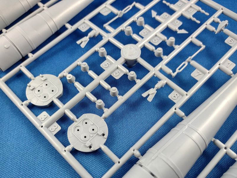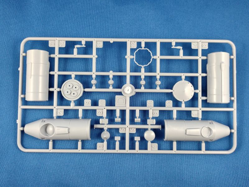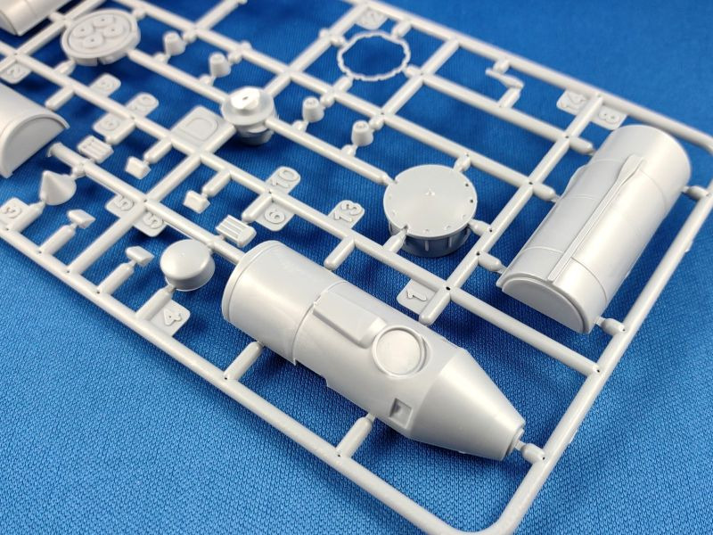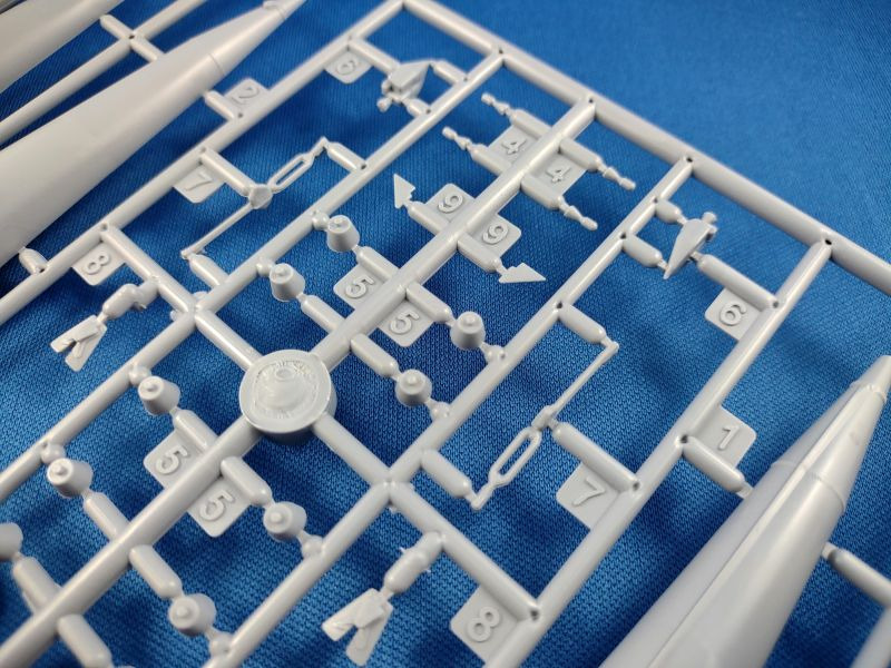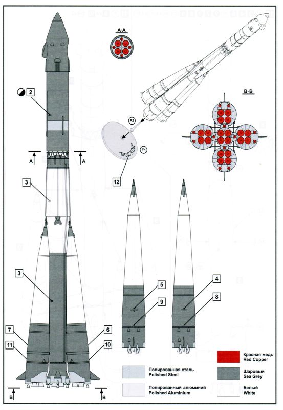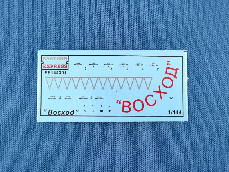 Die Woschod (russ. für Sonnenaufgang) ist eine dreistufige sowjetische Trägerrakete, welche aus der Wostok Rakete hervorging. Im Unterschied zur ihrem Vorgängermodell wurde die Woschod mit einem RD-0110-Triebwerk in der dritten Stufe ausgestattet. Damit erhöhte sich die bisherige Nutzlast von 4,7 t auf nunmehr 6,3 t. Am 16. November 1963 startete die erste Woschod mit einem militärischen Aufklärungssatelliten Zenit an Bord ins All. Der erste bemannte Flug mit einer Woschod fand ein Jahr später am 14. Oktober 1964 mit einer dreiköpfigen Besatzung statt. Bis zu ihrem letzten Einsatz am 29. Juni 1976 wurden mit der Woschod mehr 300 Starts durchgeführt. Überraschend bescherte uns 2024 der russische Hersteller Eastern Express gleich mehrere Raketen-Bausätze: 144300 – Wostok 144301 – Woschod 144302 – Sojus (1) 144303 – Sputnik 144304 – R-7A Sputnik und R-7A finden sich bislang nur auf den Kartons der drei Erstgenannten wider. Wann diese erscheinen, ist aktuell nicht zu sagen. Bei den hier genannten Bausätzen handelt es sich um komplett neue Formen. Der vorliegende Bausatz besteht aus insgesamt 96 Teilen verteilt auf fünf graue und einem transparenten Spritzgussrahmen. Ergänzt wird der Bausatz durch eine kleine Fotoätzplatine, einem kleinen Decalbogen sowie einer schwarz-weißen Montageanleitung sowie einer farbigen Bemalungsanleitung. Im gebauten Zustand erreicht das Modell eine Höhe von 31,0 cm. Folgende Spritzgussrahmen liegen bei: Spritzling A: Dieser enthält die zweite Raketenstufe mit entsprechenden Teilen wie den Rumpfhälften. Spritzling B: Dieser Spritzling liegt in doppelter Ausführung bei und beinhaltet alle Teile der ersten Stufe, welche aus den vier seitlich angeflanschten Booster-Raketen besteht. Spritzling C: Dieser Spritzling enthält wiederum die sog. dritte Stufe samt dem Nutzlast-Adapter und der Nutzlast-Verkleidung für das Woschod-Raumschiff. Spritzling F: Der Klarsichtspritzling enthält unter anderem den Ständer, auf dem das Modell später aufgesteckt wird, sowie optionale Ringe als Verbindung für die Stufen zwei und drei. Spritzling K: Der letzte Spritzling enthält die typischen Verbindungsstreben in V-Form sowie den dazugehörigen Positionierungsring, welche die Stufen zwei und drei miteinander verbinden. Fotoätzplatine: Diese enthält ebenfalls die typischen Verbindungsstreben, allerdings als ein Teil. Decalbogen: Der kleine Decalbogen ist sauber und versatzfrei gedruckt und beinhaltet neben dem Namen „Woschod“ in kyrillischer Schrift diverse Wartungs-/Sicherheitshinweise sowie in silberner Farbe die Verbindungsstreben.