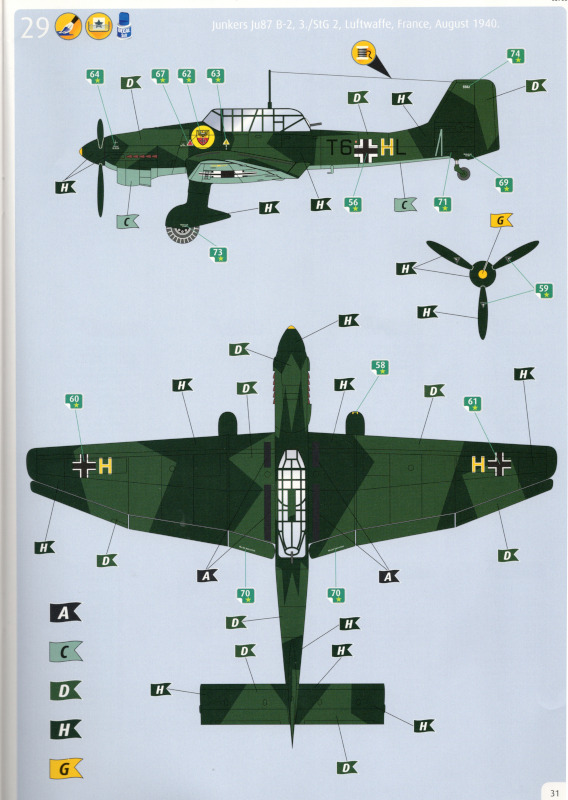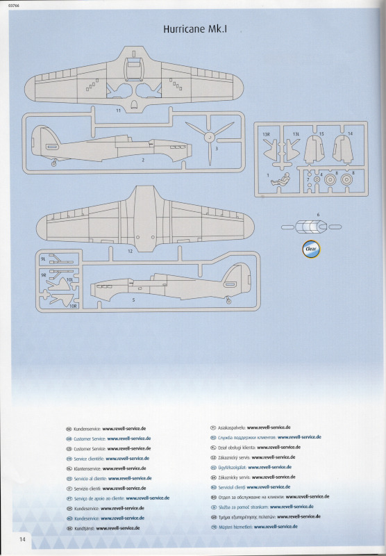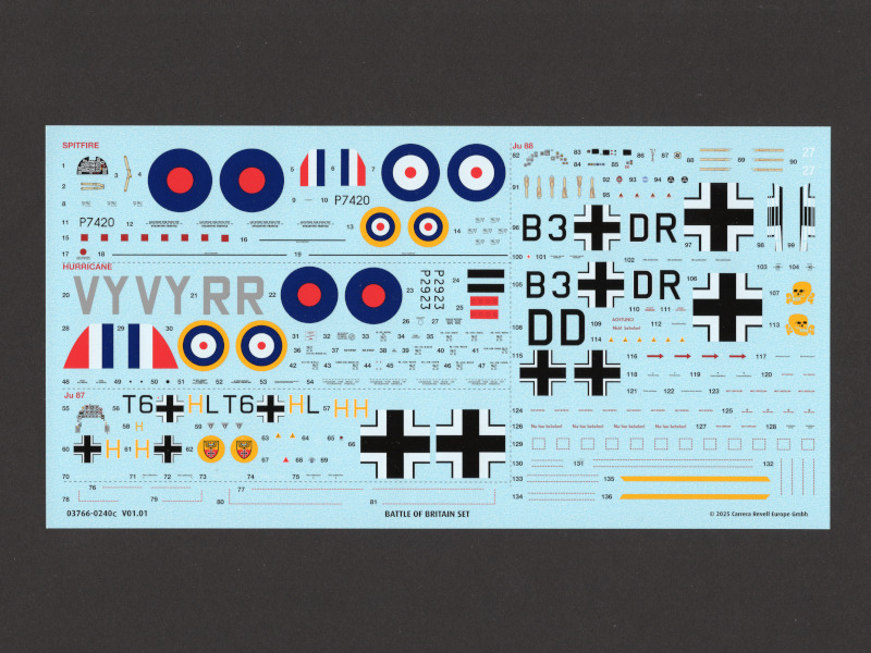 Der MarkierungsbogenDer Bogen ist die einzige Neuheit an diesem Bausatz. Die Markierungen sind glänzend und augenscheinlich fehlerfrei gedruckt. Bei der Spitfire Mk.IIa kann die Maschine mit der Werknummer P7420 dargestellt werden. Interessant ist, dass sie außer dieser Nummer keine weiteren Staffelmarkierungen trägt. Bei der Hurricane Mk.Ia kann die Werknummer P2923, Kennung VY-R, der No. 85 Sqn. dargestellt werden. Hier sind auch eine größere Anzahl an Wartungshinweisen enthalten. Die gleiche Maschine war auch im ersten Set von 2010 enthalten. Bei der Junkers Ju 87 B-2 kann die T6+HL der 3./StG 2 aus der Zeit August 1940 dargestellt werden. Auch hier sind ein paar Wartungshinweise enthalten. Die gleiche Maschine war auch im ersten Set von 2010 enthalten. Bei der Junkers Ju 88 A-1 kann die B3+DR der 7./KG 54 aus der Zeit September 1940 dargestellt werden. Hierfür entfallen die meisten Markierungen des gesamten Bogens. Zahlreiche Wartungshinweise warten darauf, verarbeitet zu werden. Zusätzlich ist zu erwähnen, dass Revell hier die Markierungen der 1:32er Version des Bausatzes verwendet hat. Darstellbare Maschinen: