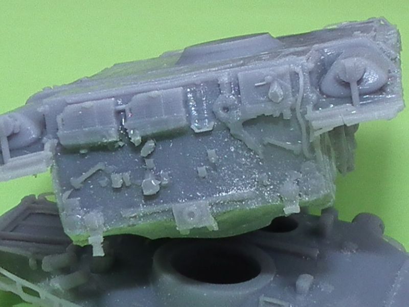 Zum Modell:Ob das die Zukunft des Modellbaus ist? Viel ist bis zum fertigen Modell nicht zu tun. Zumindest ist das Heller-Uralt-Modell damit überholt. Der Preisunterschied ist aber erheblich. Zuerst darf man die 9 Bauteile aus dem Druck herausarbeiten. Der Druck ist sehr fein. Es ist schwierig bei den extrem dünnen Teilen nichts abzubrechen. Die Kunststoffteile haben gute Qualität. Die Passgenauigkeit ist ok. Es bleibt einiges an Nacharbeit. Der Kunststoff ist nicht spröde, splittert nicht und verträgt auch einiges an Biegung. Die zwei Luken liegen einzeln bei. Sie offen zu lassen bringt nichts, der Turm ist nicht hohl. Er wird im Ganzen auf die Wanne gesetzt und kann drehbar bleiben. Eine Verzahnung oder Verriegelung ist nicht vorhanden - evtl festkleben? Die Kanone hat schon eine Mündungsöffnung - Aufbohren unnötig. Die Wanne ist auf der Unterseite nicht detailliert, keine Wartungsdeckel oder ähnliches. Es muss dort noch nachgespachtelt werden, um eine ebene Fläche zu erhalten. Die Detaillierung oben ist sehr gut; Werkzeuge, Seile, selbst die Seilkauschen sind zu sehen. Der Schutz der Lampen usw. alles hoch filigran. Die Kette einschließlich Fahrwerk ist einteilig. Die unkomplizierte Montage zieht eine aufwändige Bemalung nach sich. Die Kette ist außen gut detailliert, innen sind die Führungszähne dargestellt – ansonsten weniger Details. Die Räder weisen eine ordentliche Struktur auf. Die Zweiteilung ist gut angedeutet. Nur ein einzelnes kleines Rad ist verdruckt und muss mit Spachtel aufgebaut werden. Die Kettenabdeckung hat eine ansehnliche Dicke und muss per Schleifmaschine oder Säge deutlich nachgearbeitet werden. Schutzbrille und Maske nicht vergessen.