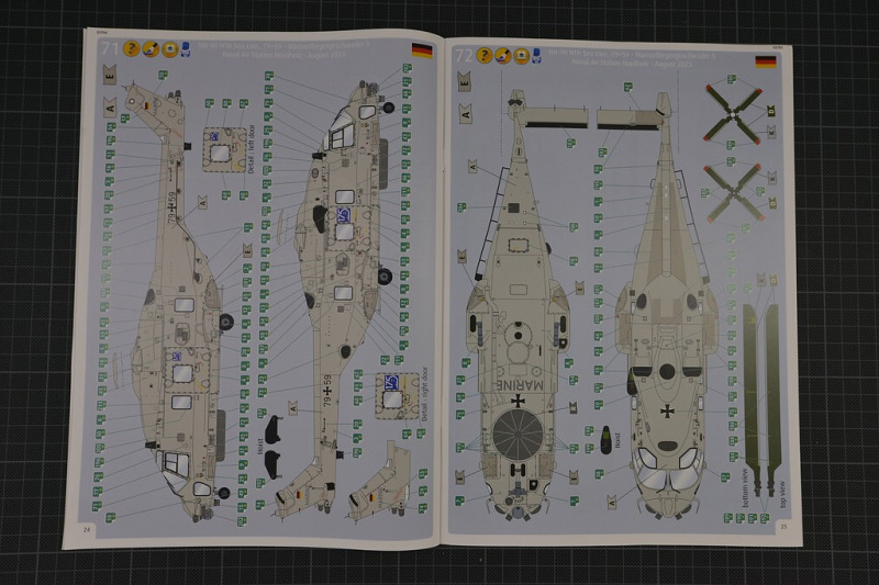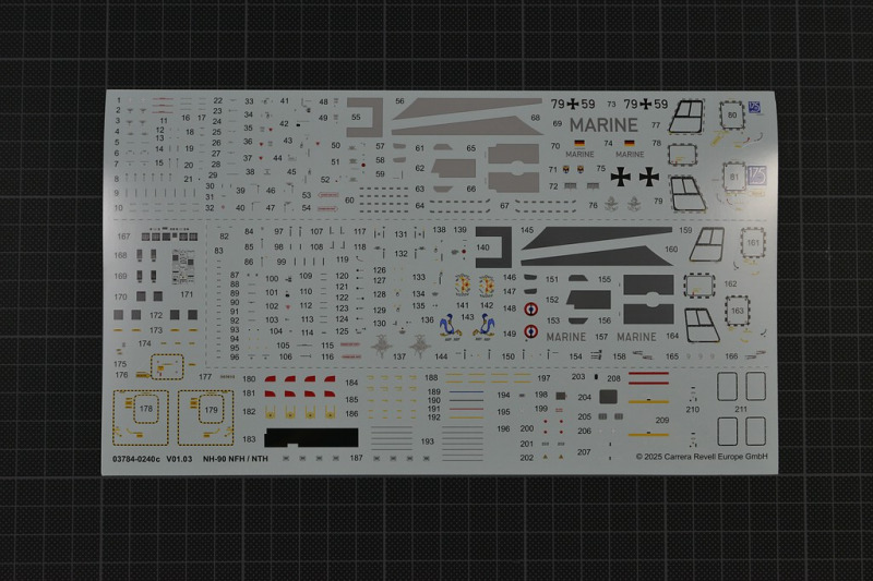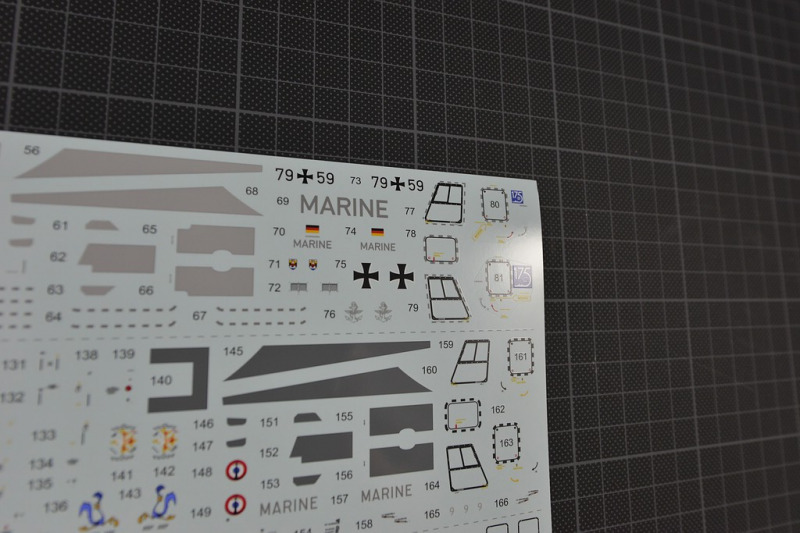 Der Decalbogen von Cartograf ist sauber und versatzfrei gedruckt. Leider ist es nicht möglich, ohne die Schere oder das Skalpell anzusetzen, eine reine, normale deutsche Maschine zu bauen. Denn der blaue 175 Jahre Marine-Aufkleber ist mit an die Fensterumrandung gedruckt. Die Bauanleitung ist revelltypisch, auch das Farbsystem und das mischen einzelner Farben ist obligatorisch. Immerhin sind 70 Bauabschnitte zu bewältigen, bevor die unzähligen Decals aufgebracht werden wollen. Darstellbare Maschinen: